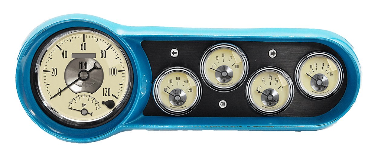 Includes aluminum gauge panels (brushed & black anodized), Auto Meter Antique Ivory gauges, and LED turn signal & high beam indicators.