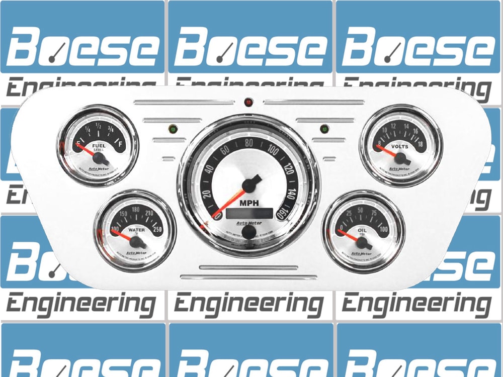 Includes aluminum gauge panel, Auto Meter American Muscle gauges, & LED lights (turn signal & high beam indicators).