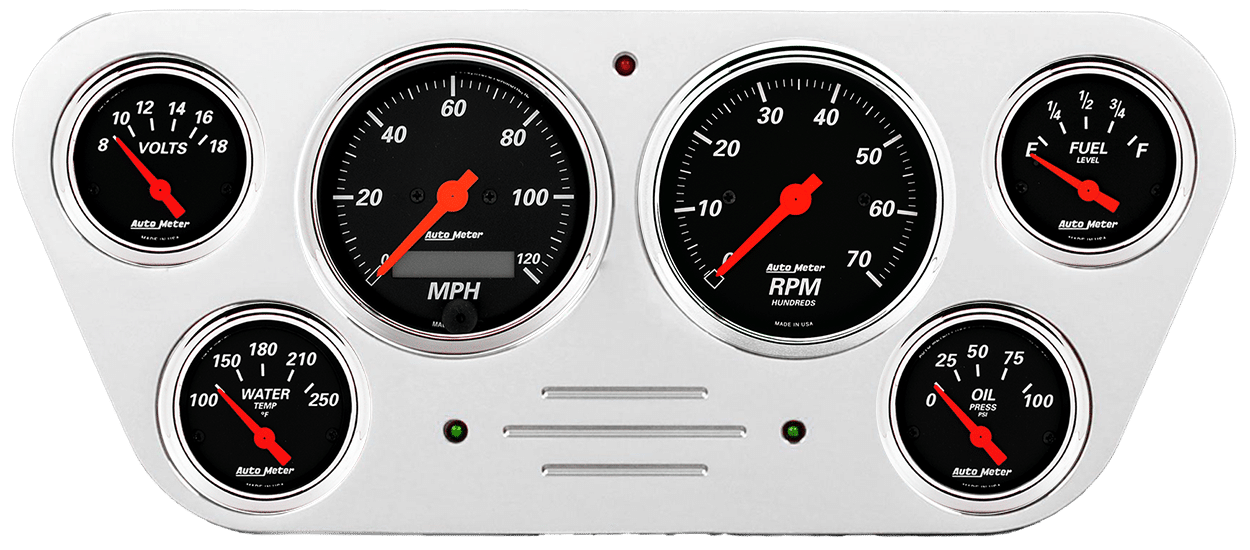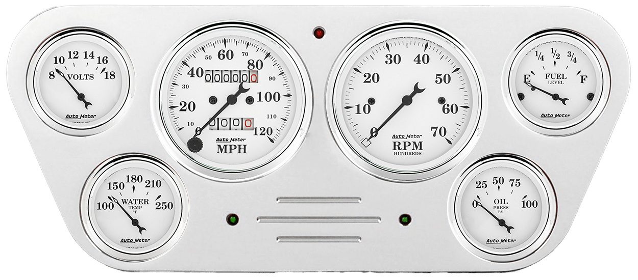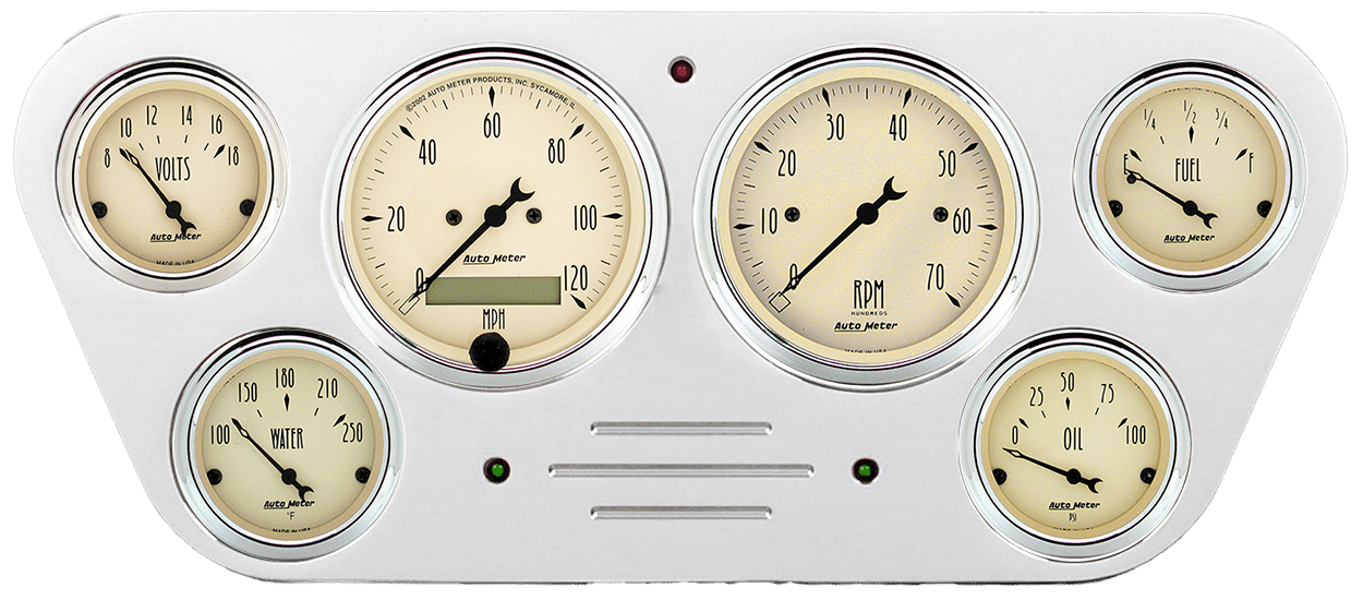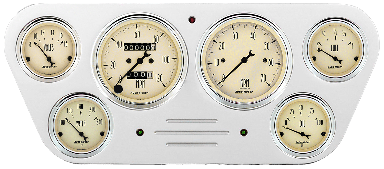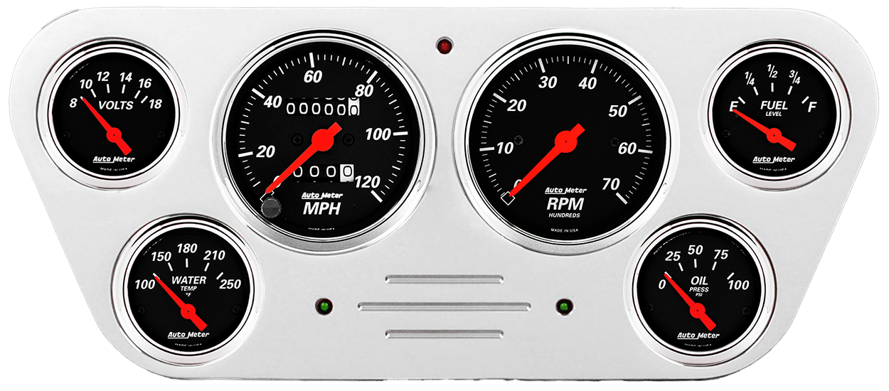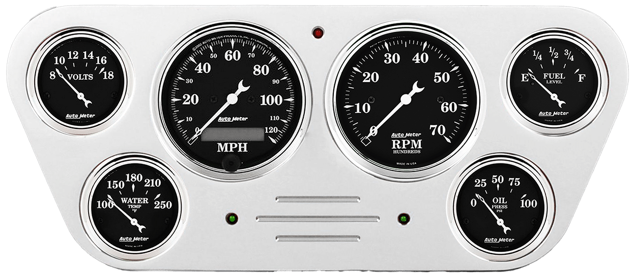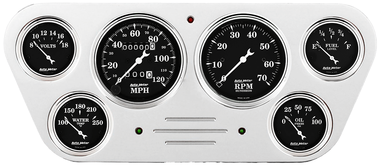 Includes aluminum dash insert, Auto Street Rod series gauges & turn signal/high beam indicators.