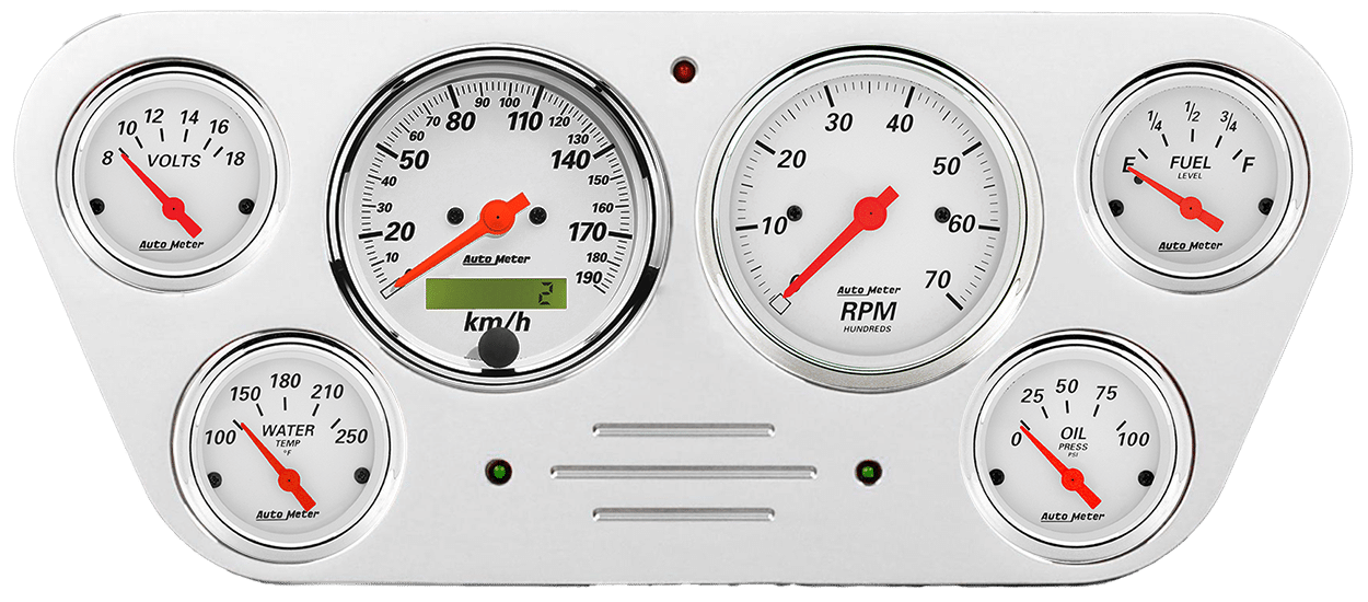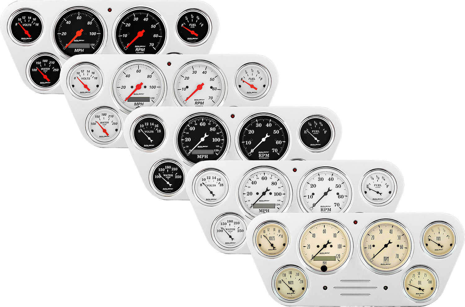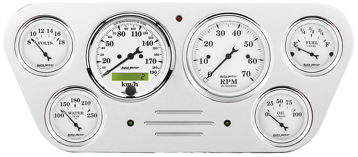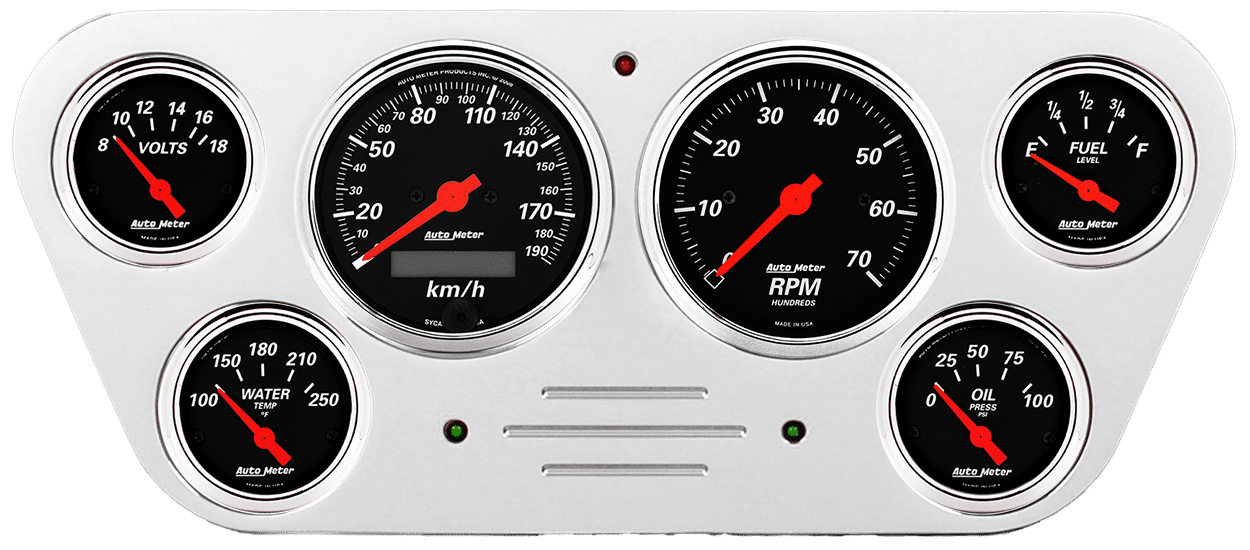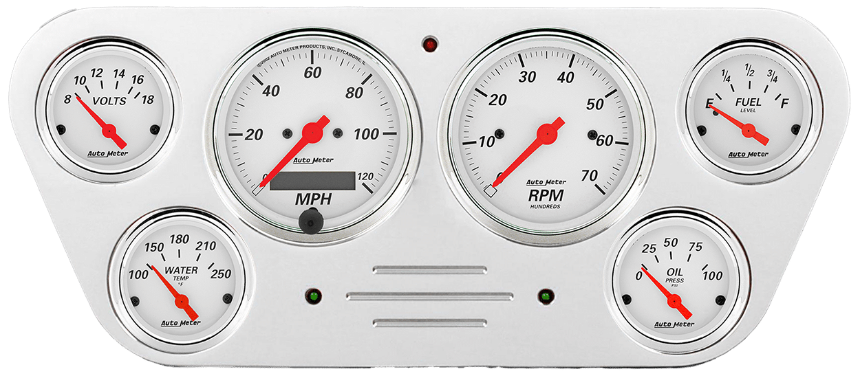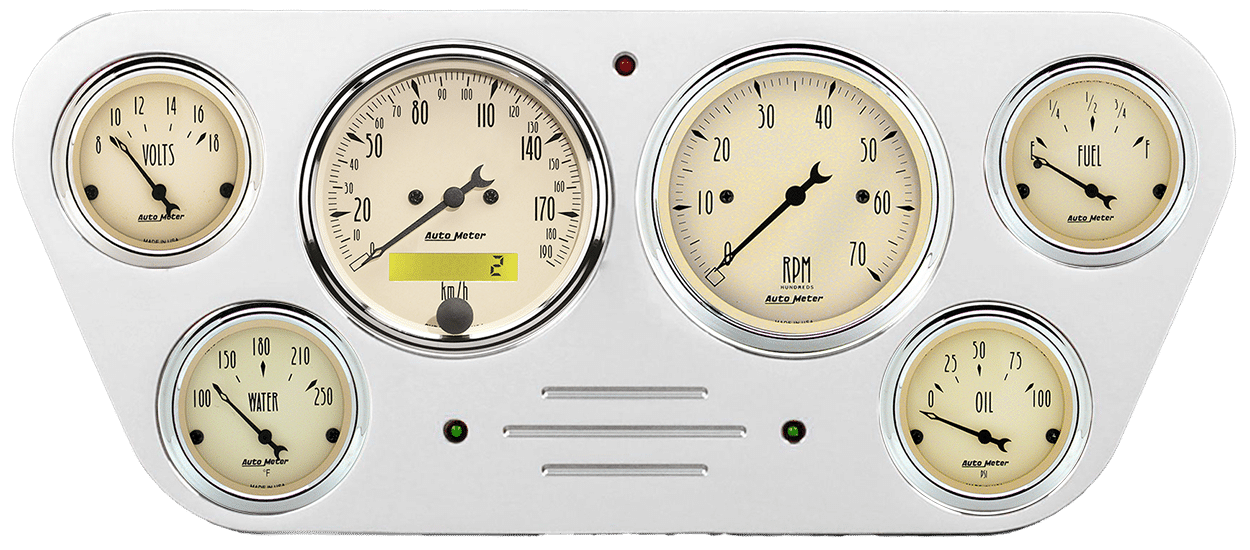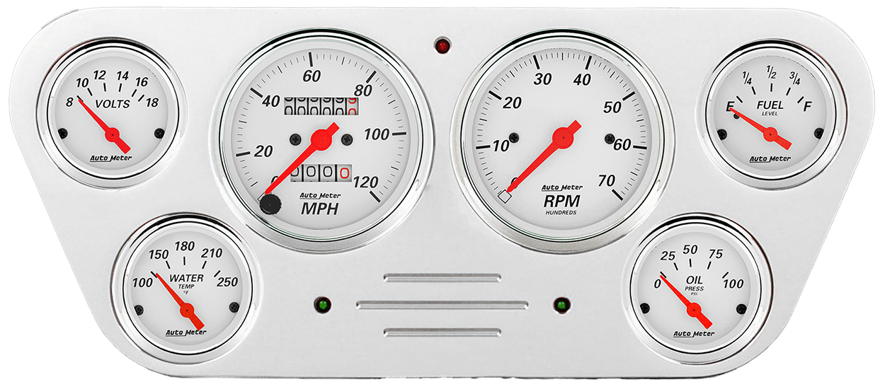 Includes aluminum dash insert, Auto Street Rod series gauges & turn signal/high beam indicators.