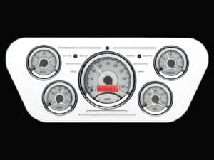 Includes aluminum dash insert, Auto Meter Ford Masterpiece Silver gauges & turn signal/high beam indicators.