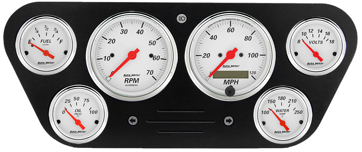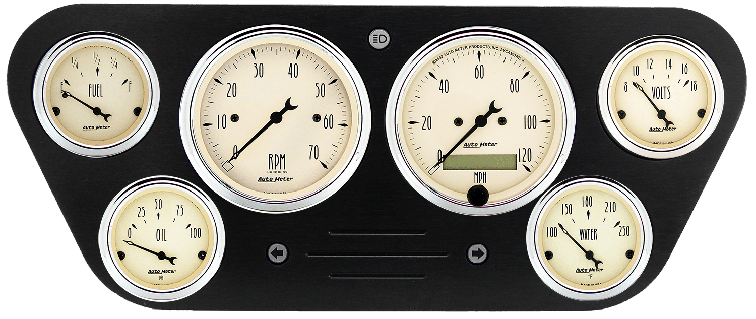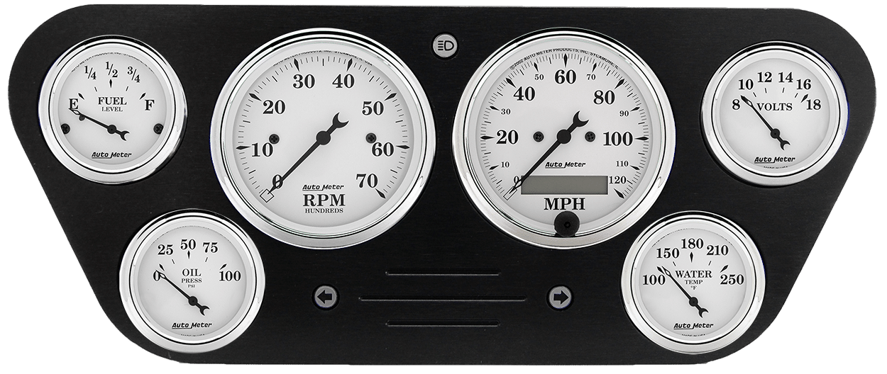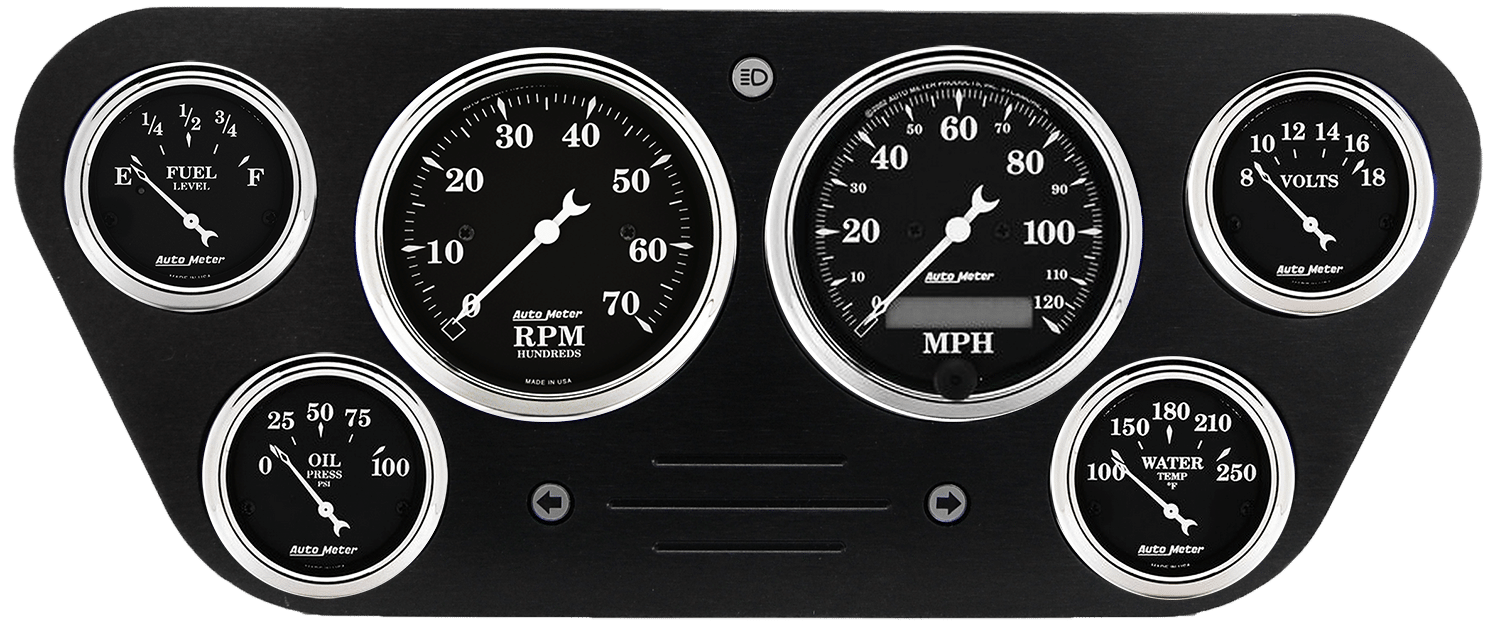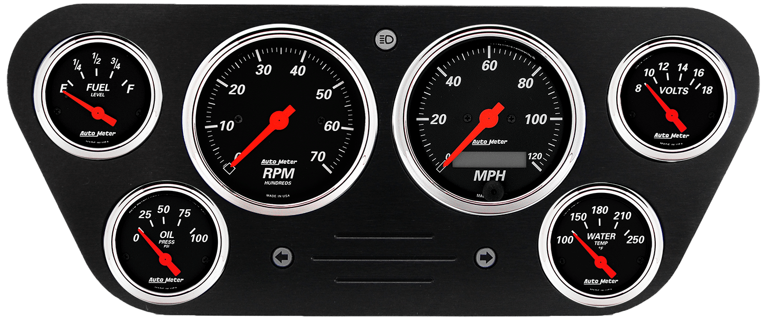Includes aluminum brushed & black anodized gauge panel, Auto Street Rod series gauges, & 8mm turn signal/high beam indicators.