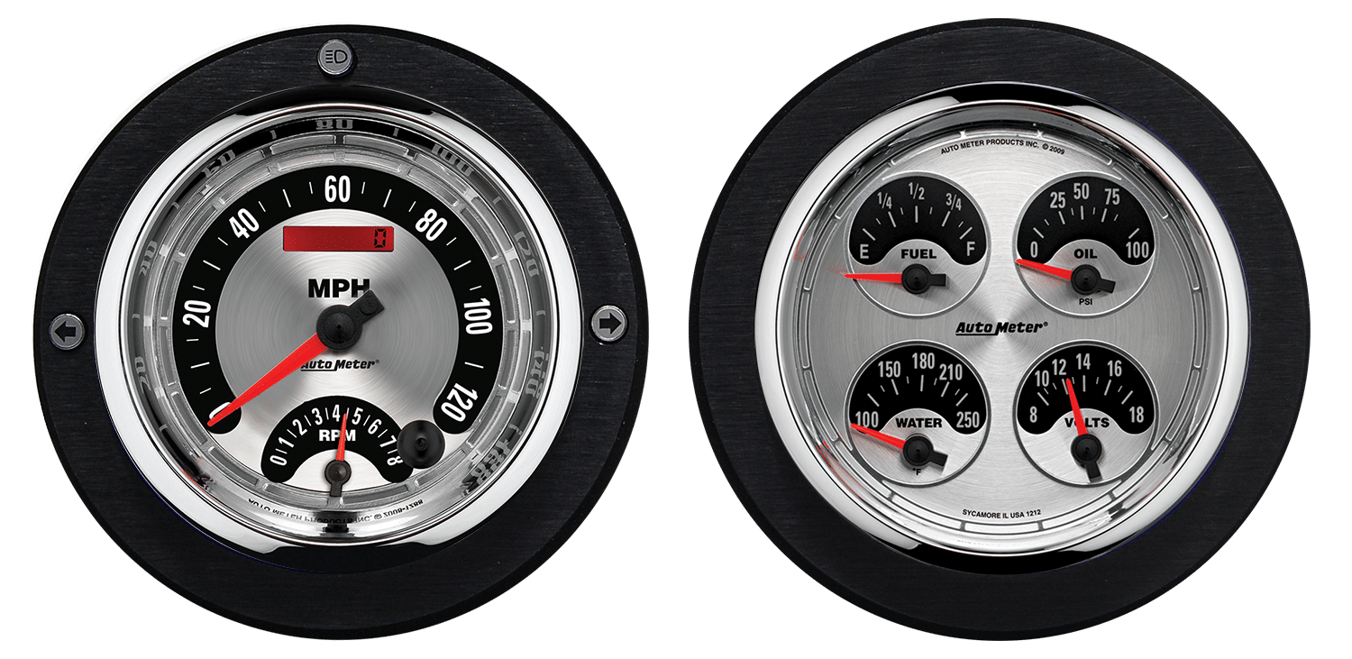 Includes brushed and black anodized aluminum adapter rings, Auto Meter American Muscle 5″ gauges, & 8 MM LED lights (turn signal & high beam indicators).