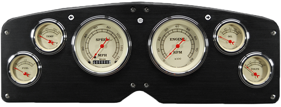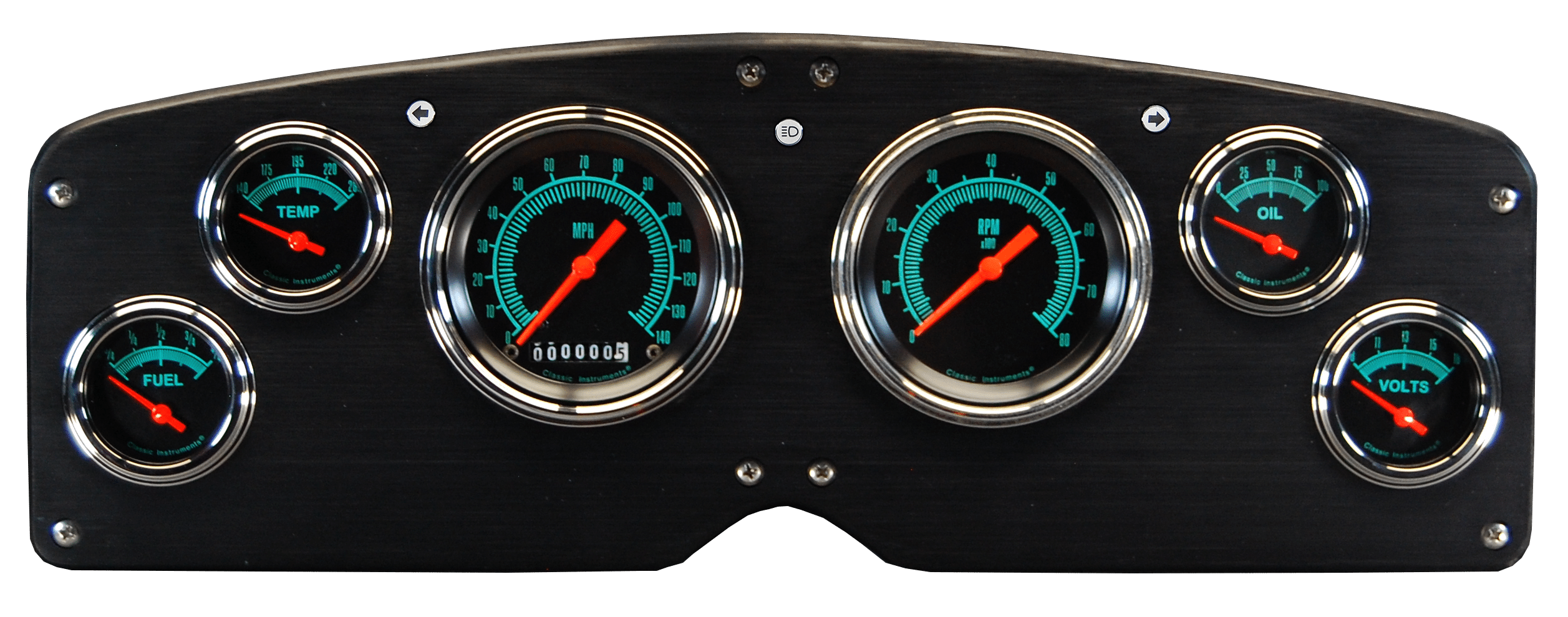 Includes aluminum gauge panel, Classic Instruments gauges & LED lights (turn signal & high beam indicators).