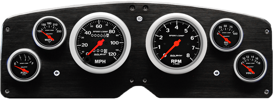 Includes aluminum gauge panel, Auto Meter Sport-Comp gauges, & LED lights (turn signal & high beam indicators).