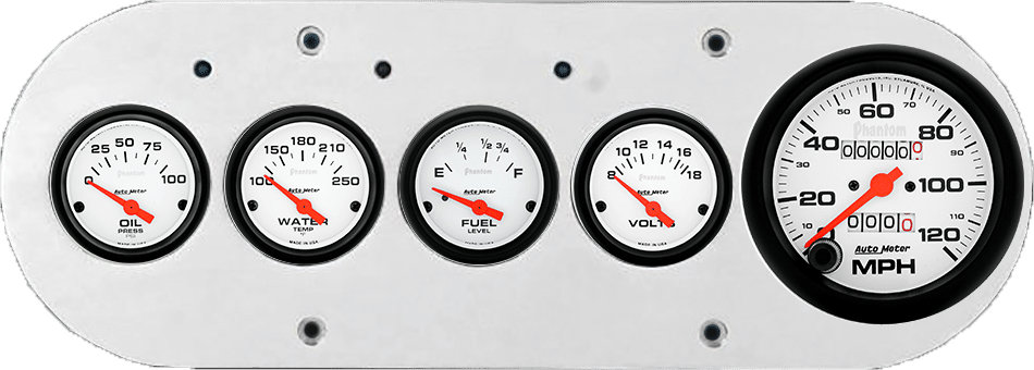 Includes aluminum gauge panel, Auto Meter Phantom gauges, & LED lights (turn signal & high beam indicators).