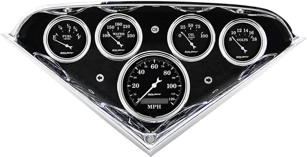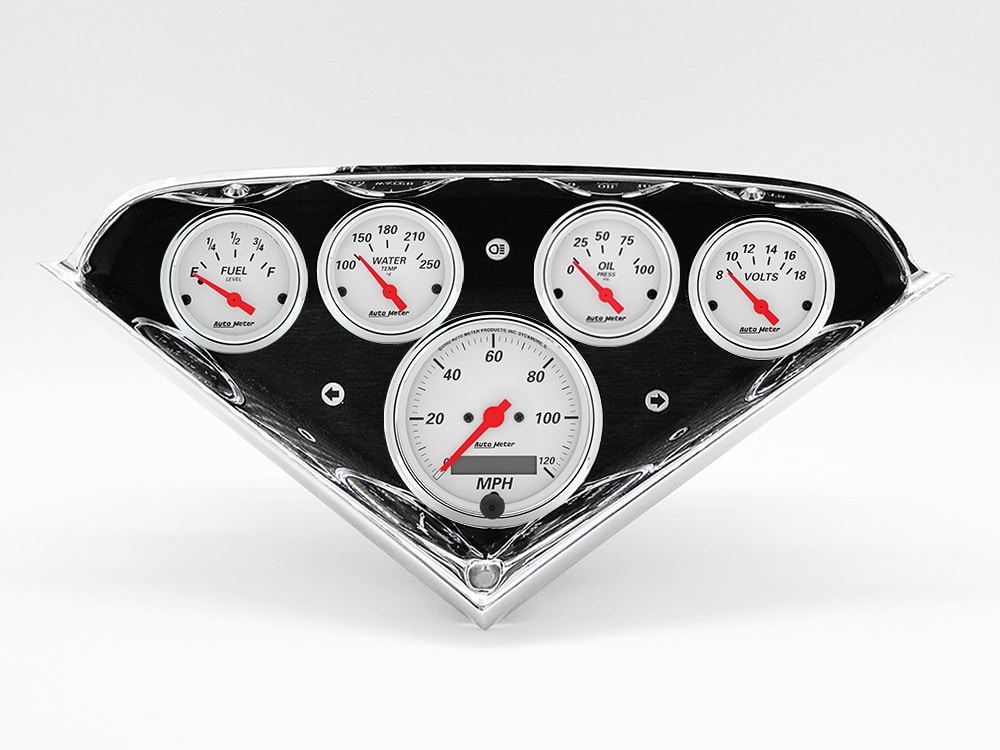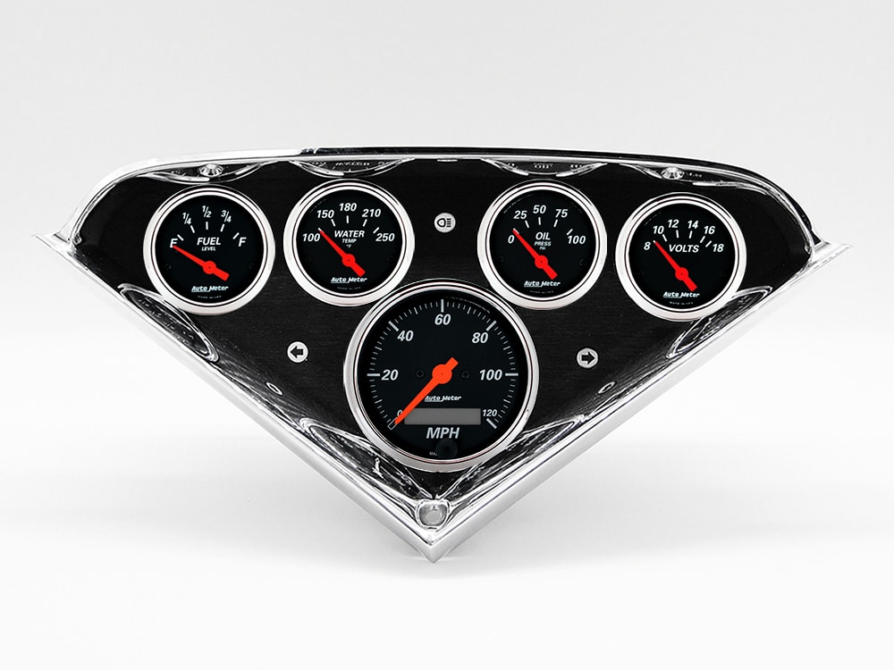 Includes brushed and black anodized aluminum dash insert, Auto Street Rod series gauges & turn signal/high beam indicators.