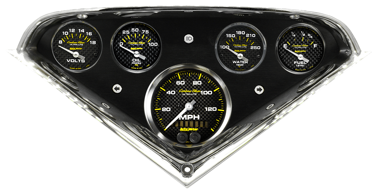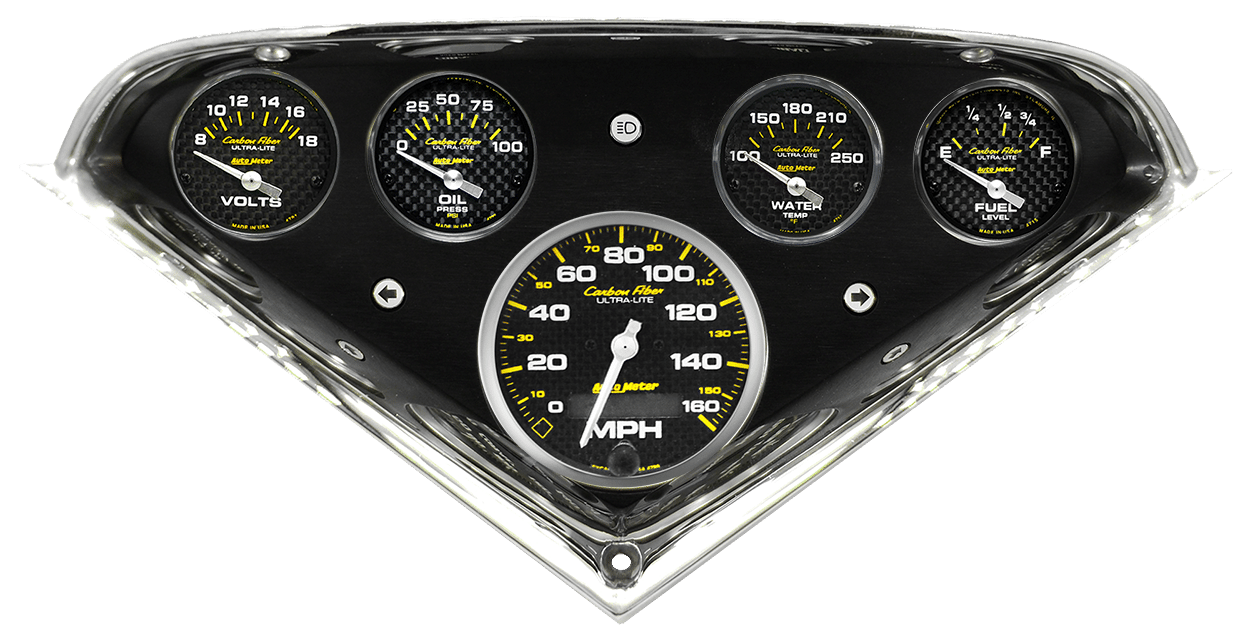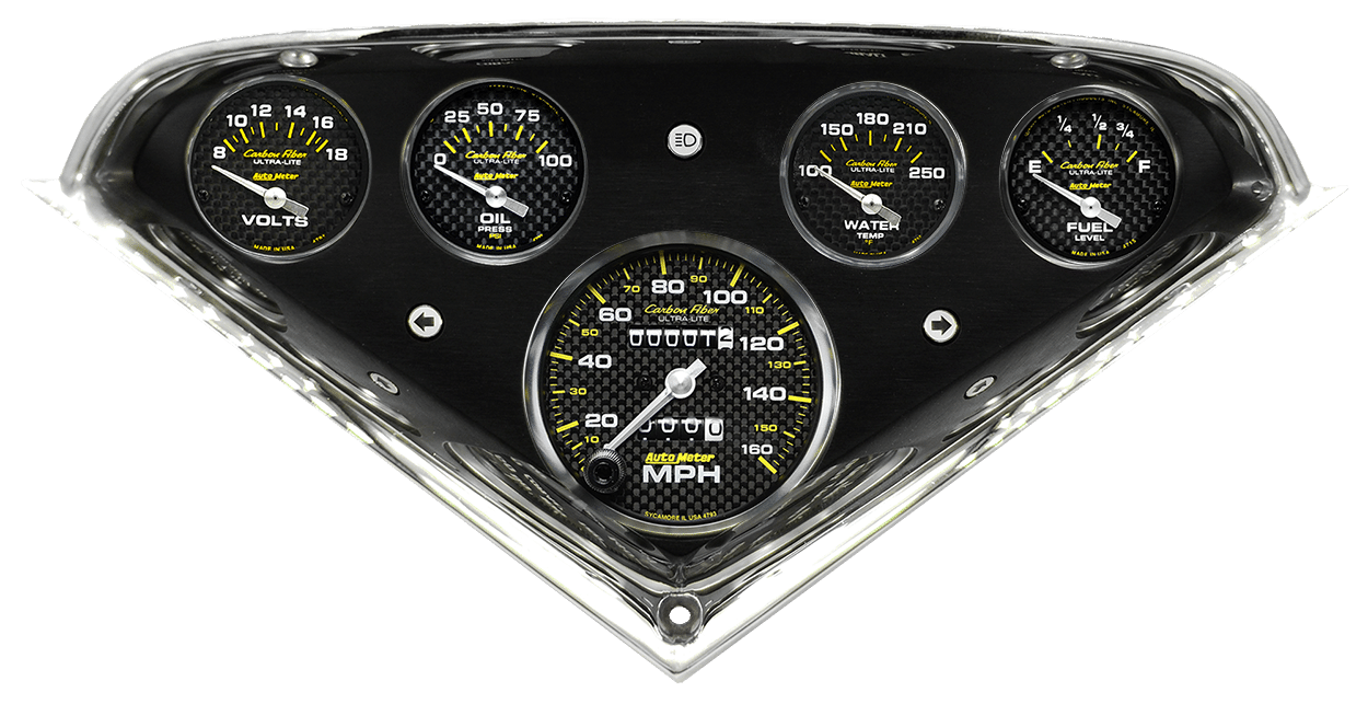 Includes brushed and black anodized aluminum gauge panel, AutoMeter Carbon Fiber gauges, & LED turn signal & high beam indicators.