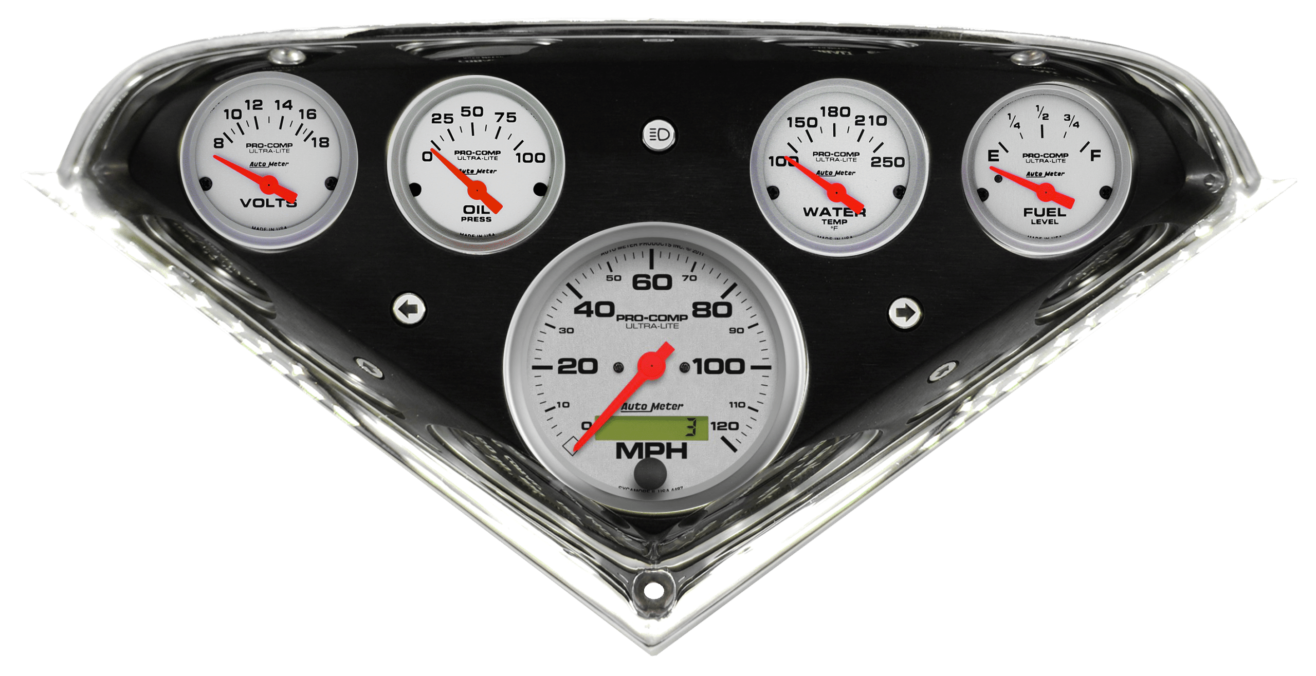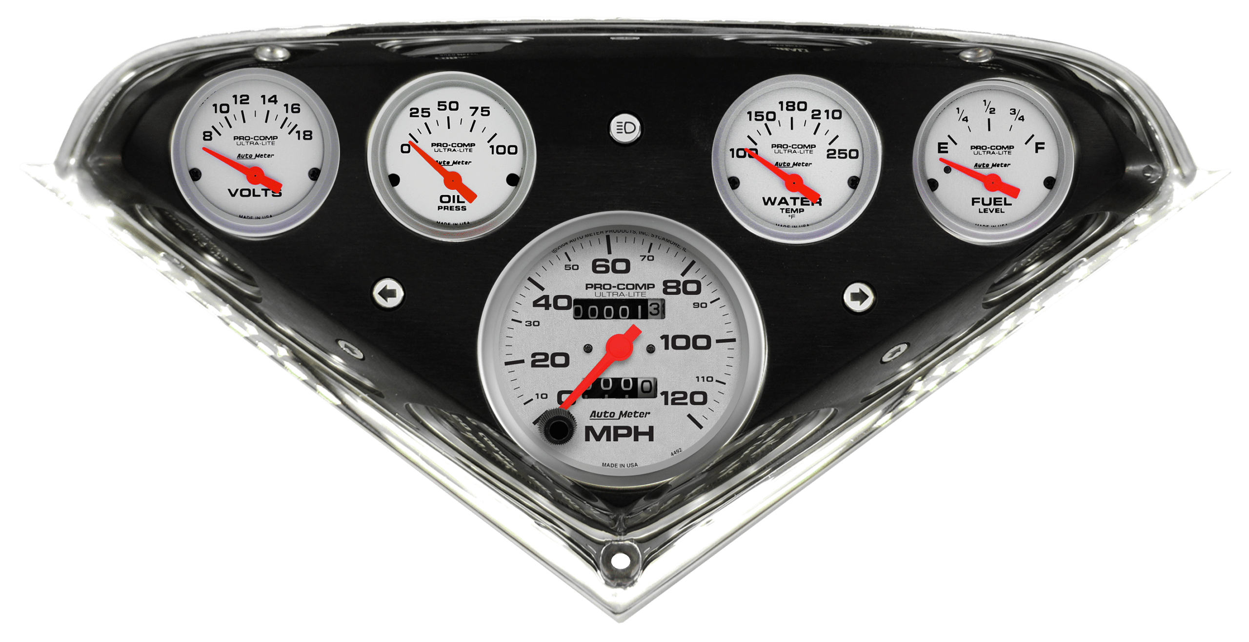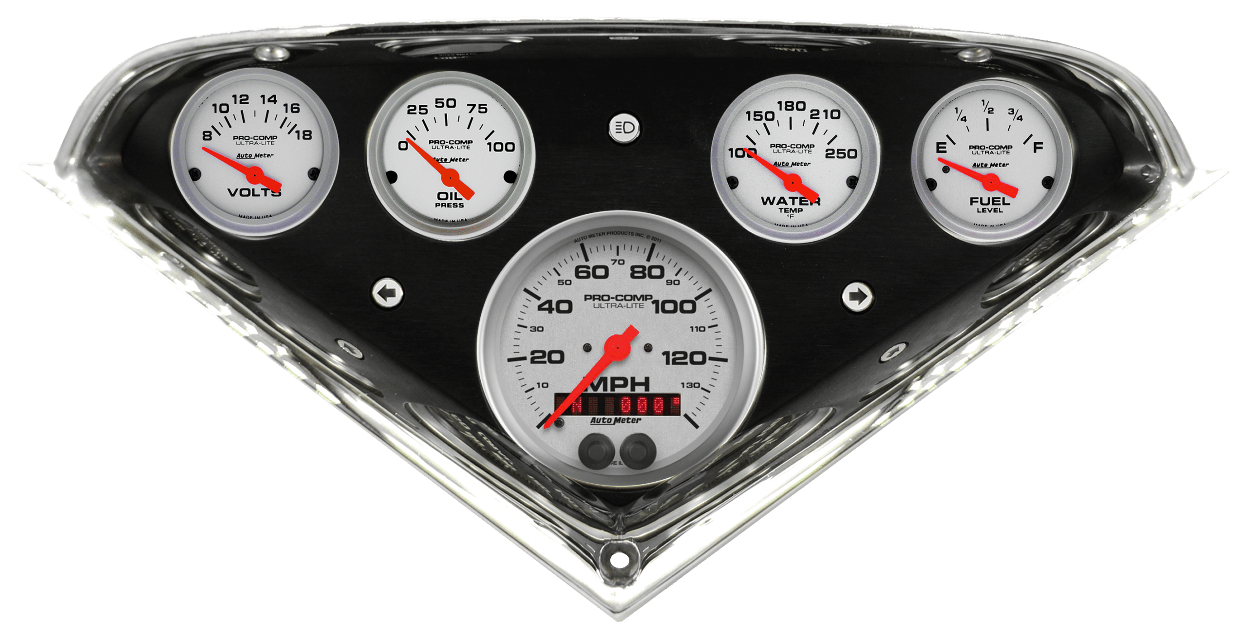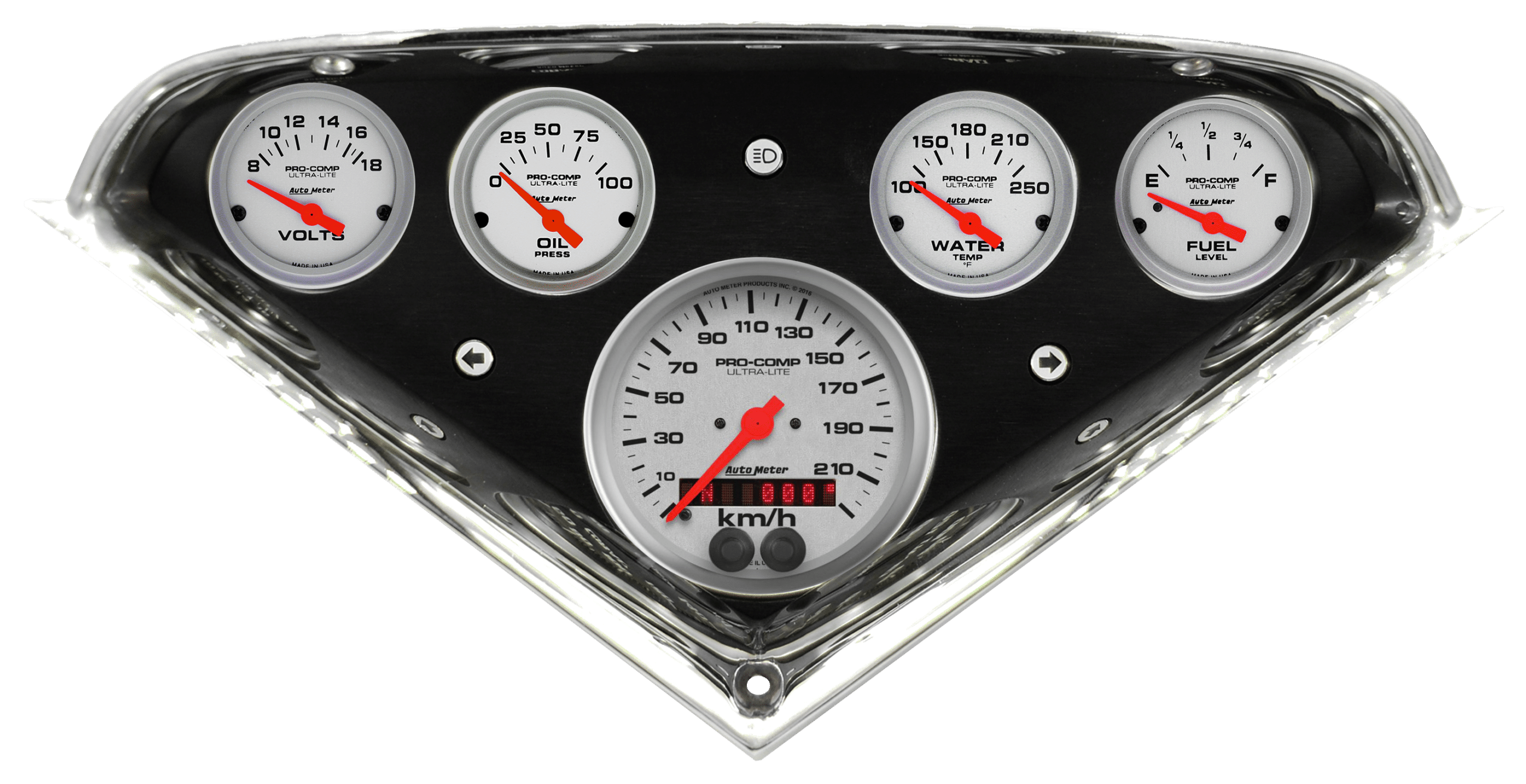 Includes brushed and black anodized aluminum gauge panel, AutoMeter Ultra-Lite gauges, & LED turn signal & high beam indicators.