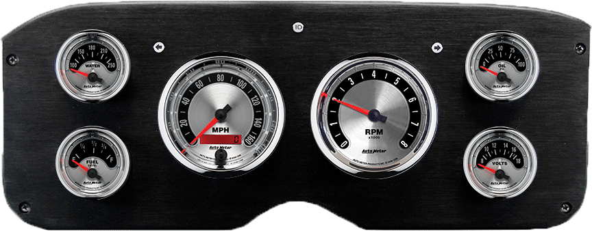Includes aluminum gauge panel, Auto Meter American Muscle gauges, & LED lights (turn signal & high beam indicators).