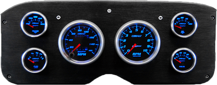 Includes aluminum dash insert, Auto Meter Cobalt gauges, & turn signal/high beam indicators.