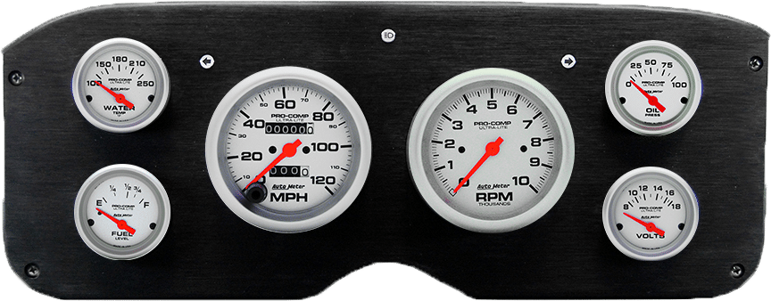 Includes aluminum gauge panel, Auto Meter Ultra-Lite gauges, & LED lights (turn signal & high beam indicators).