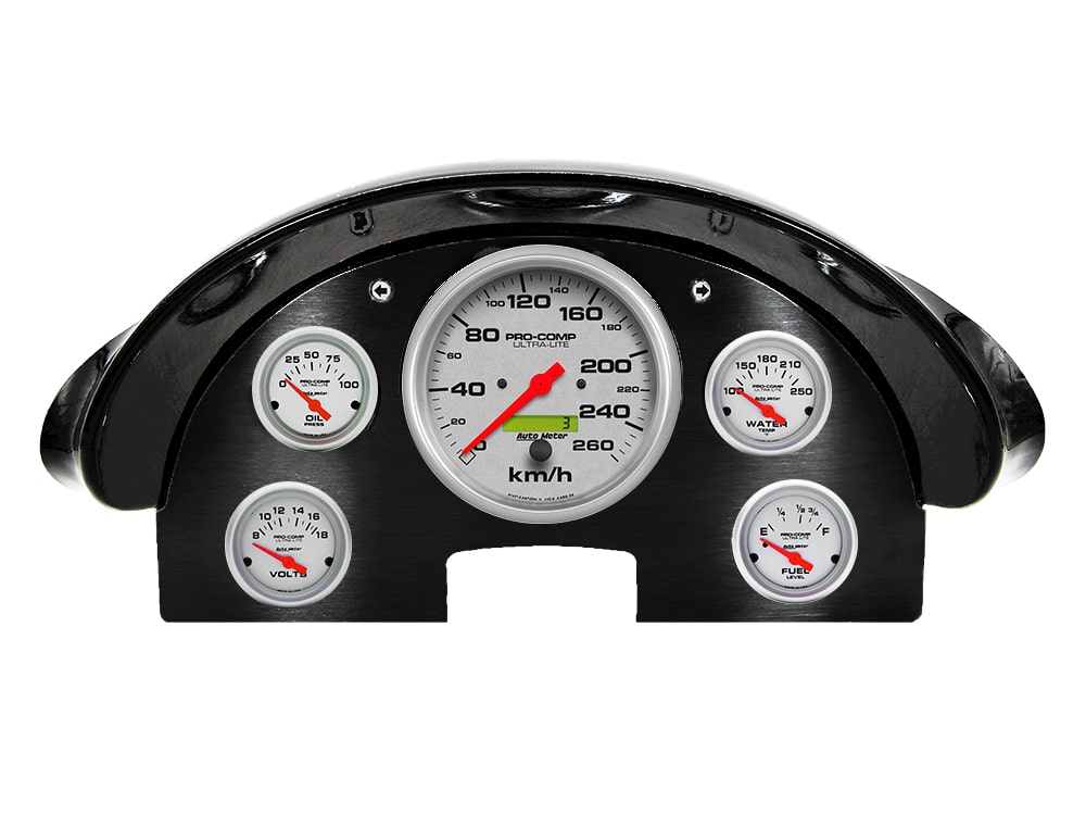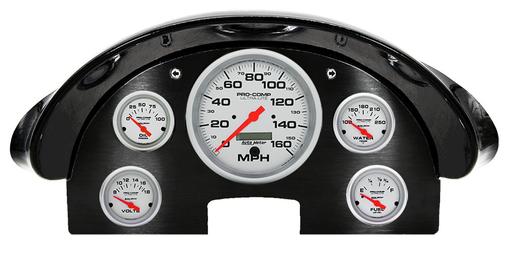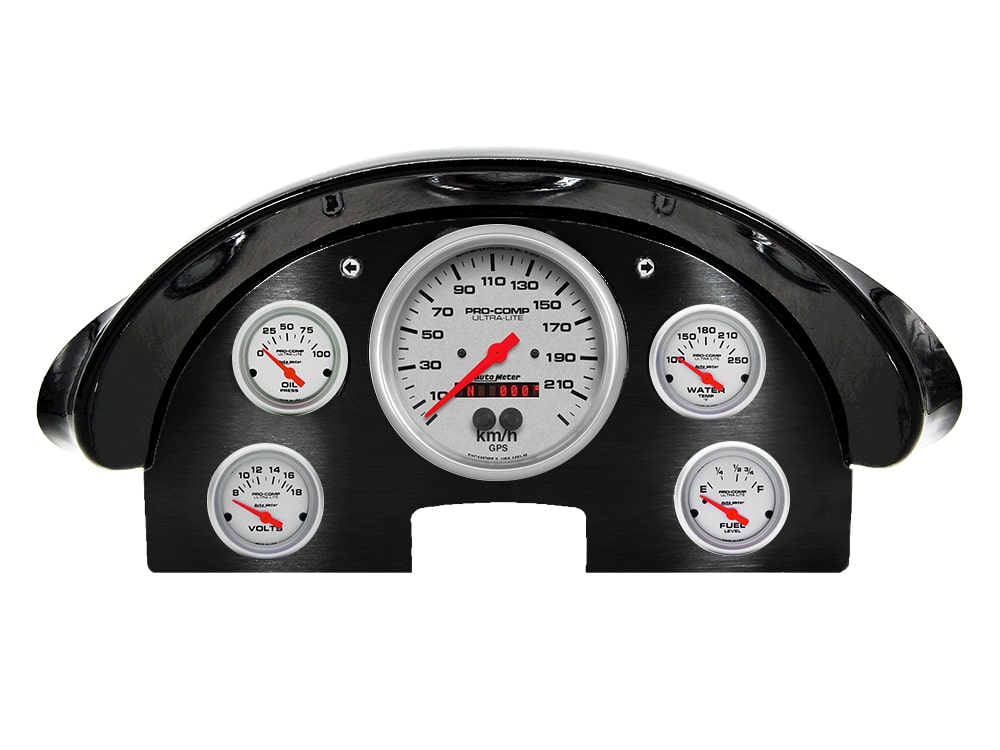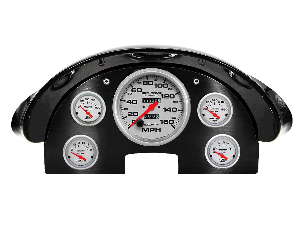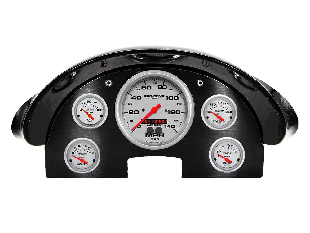 Includes brushed or brushed black aluminum gauge panel, mounting hardware, turn signal indicators & Auto Meter Ultra-LIte gauges.