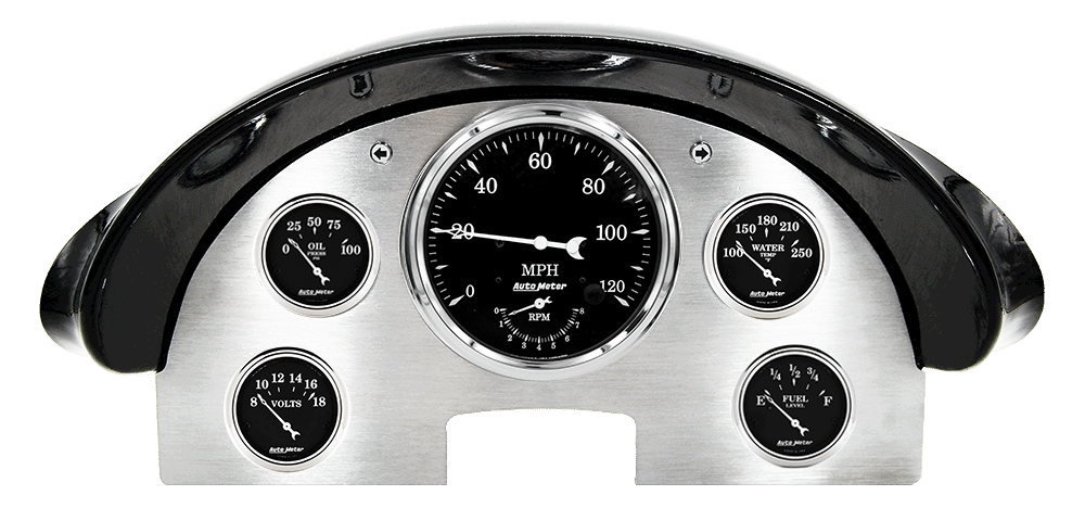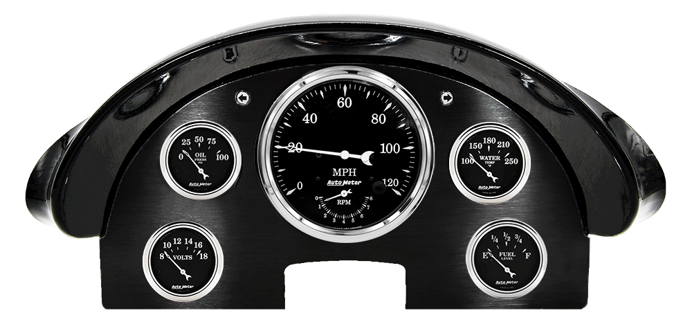 Includes aluminum adapter panel, AutoMeter Old Tyme Black gauges, & turn signal indicators.