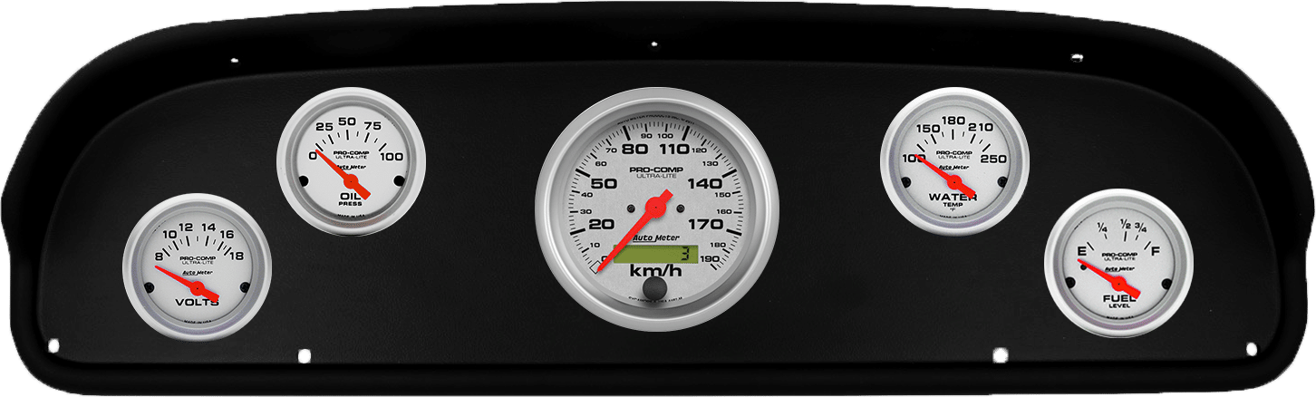 Direct Fit replacement for OEM instrument bezel for 1957-60 Ford Truck. Made from thermoformed UV protected ABS material with AutoMeter Ultra-Lite gauges.
