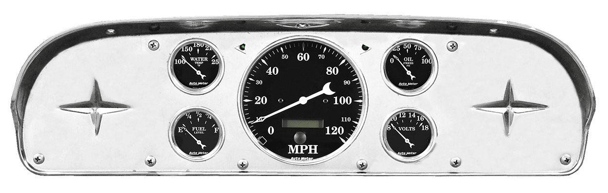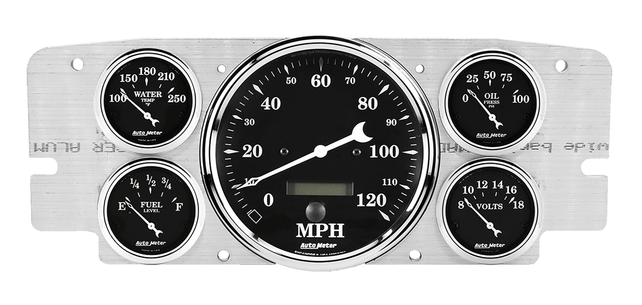 Includes aluminum gauge adapter panel, AutoMeter Old Tyme Black gauges & turn signal indicators.
