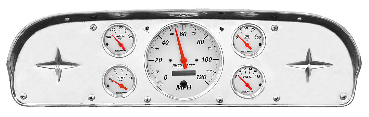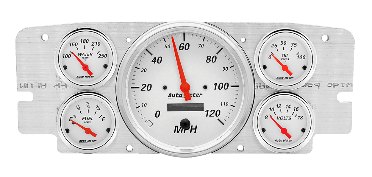 Includes aluminum gauge adapter panel, AutoMeter Arctic White gauges & turn signal indicators.