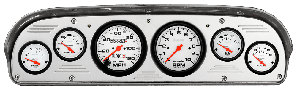 Includes aluminum gauge panel, Auto Meter Phantom gauges, & LED lights (turn signal & high beam indicators).