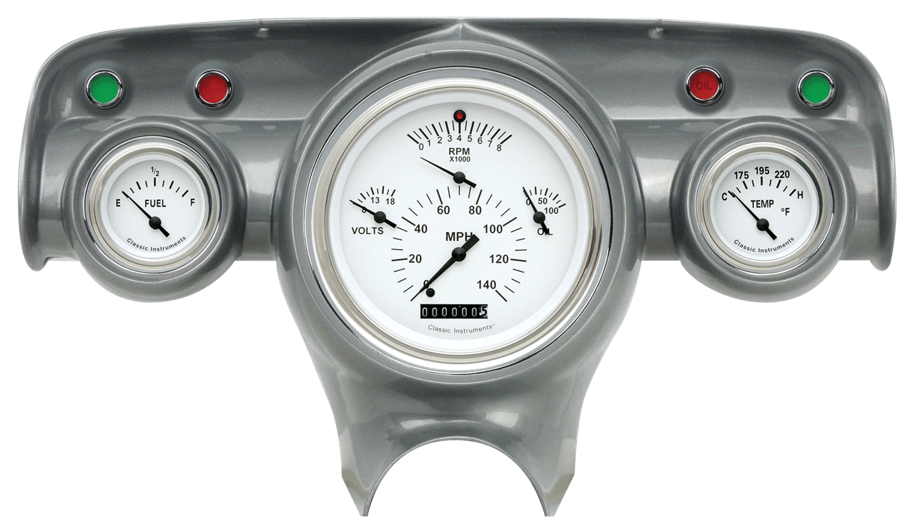 The 57 Chevy Package includes: An electronic 140 MPH speedo, 8,000 RPM tachometer, oil pressure, voltmeter, water temperature, and 0-30 fuel gauges (works w/ stock fuel sender), plus GXL18 color coded wiring harness. Sending units for speedometer, oil pressure, & water temperature gauges are included. A gear selection indicator insert for automatic or overdrive transmission is optional. Fits your stock gauge bezel (NOT included).