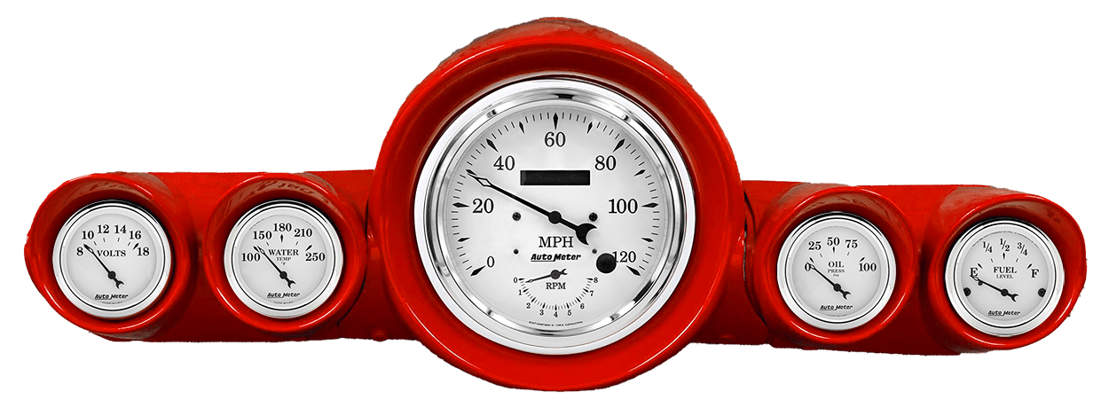 Includes aluminum adapter ring & Auto Meter Old Tyme White gauges. Gauges include:- 5” electric 120 MPH / 8,000 RPM speedometer/tachometer combination gauge