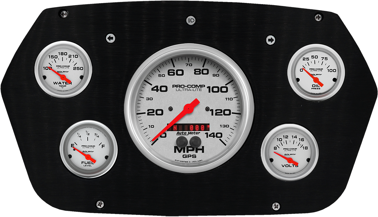 Includes aluminum gauge panel & Auto Meter Ultra-Lite gauges.