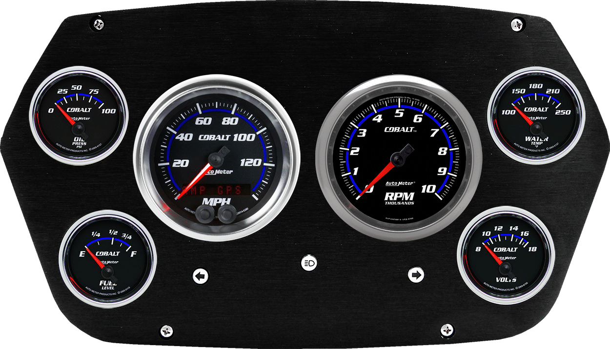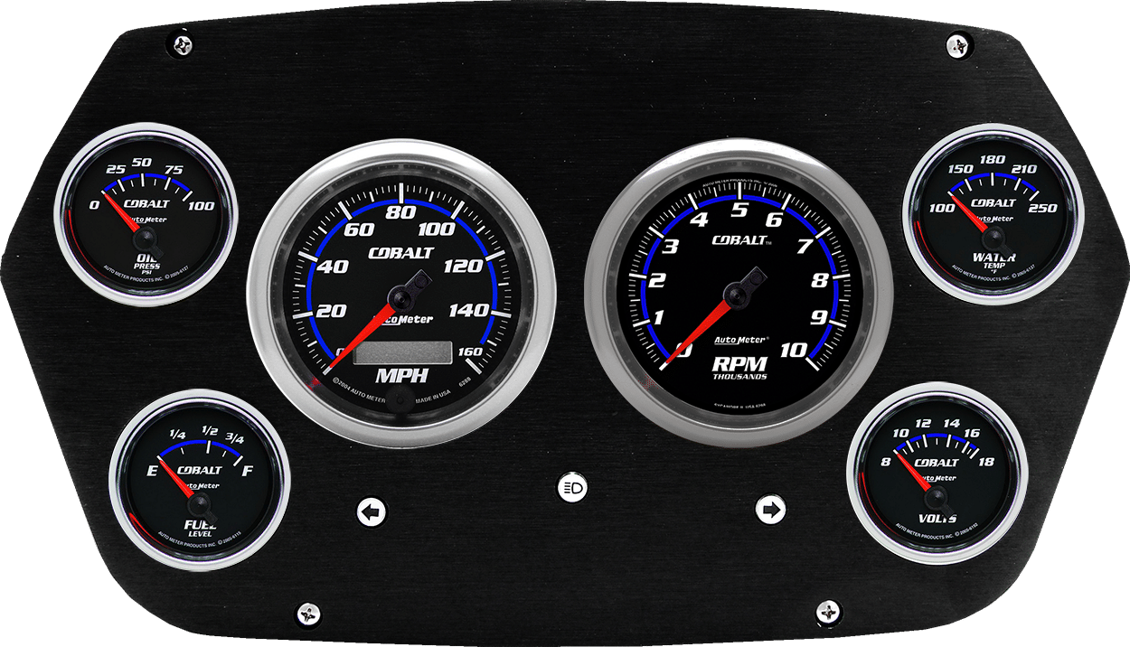 Includes aluminum dash insert, Auto Meter Cobalt gauges, & turn signal/high beam indicators.
