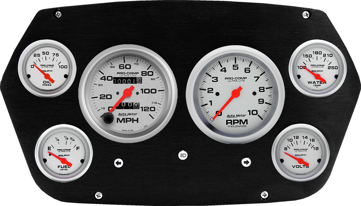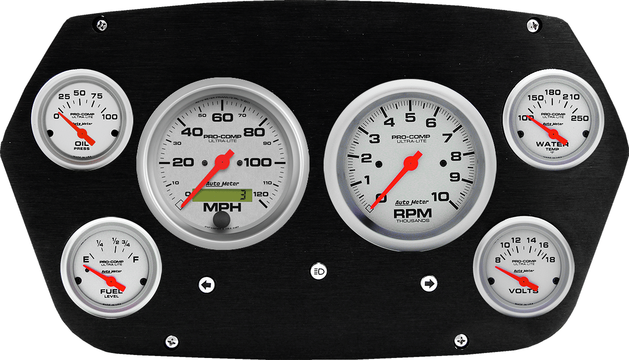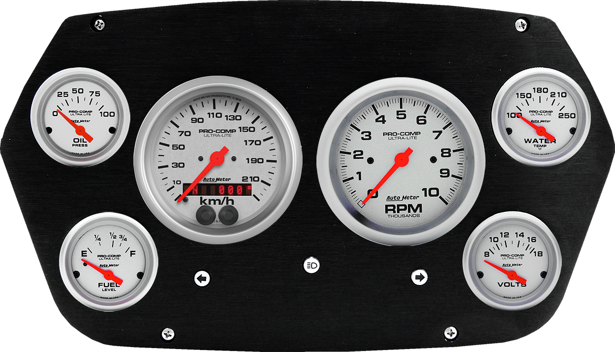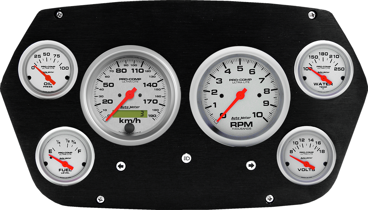 Includes aluminum gauge panel, Auto Meter Ultra-Lite gauges, & LED lights (turn signal & high beam indicators).