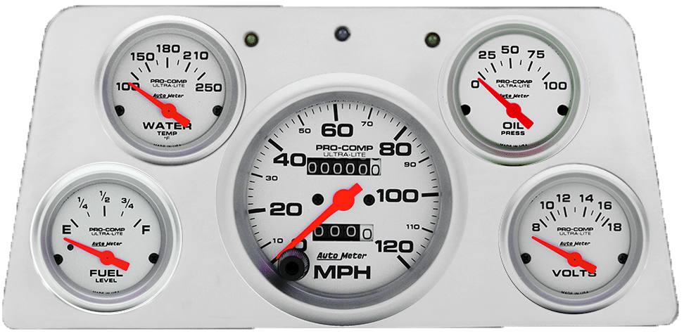 Includes aluminum gauge panel, Auto Meter Ultra-Lite gauges, & LED lights (turn signal & high beam indicators).