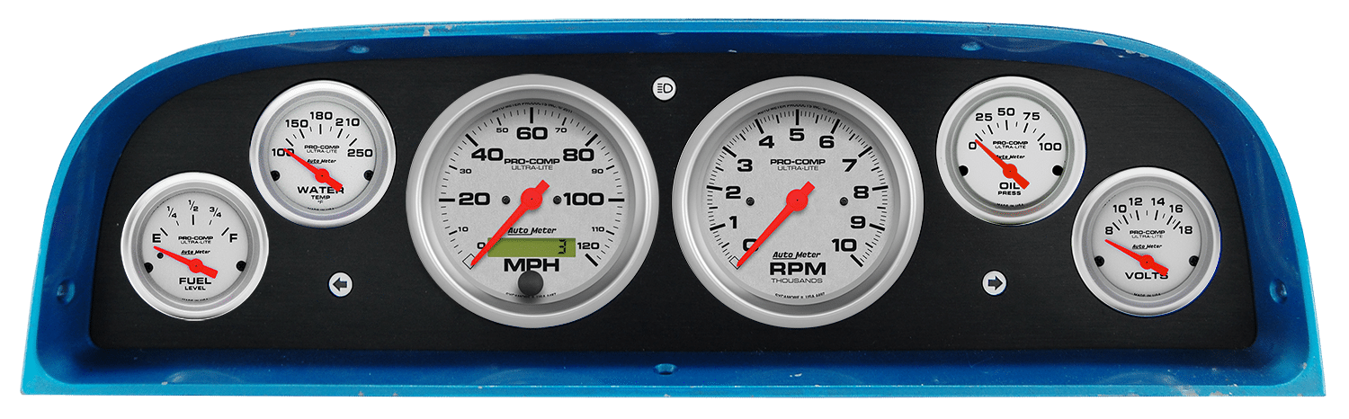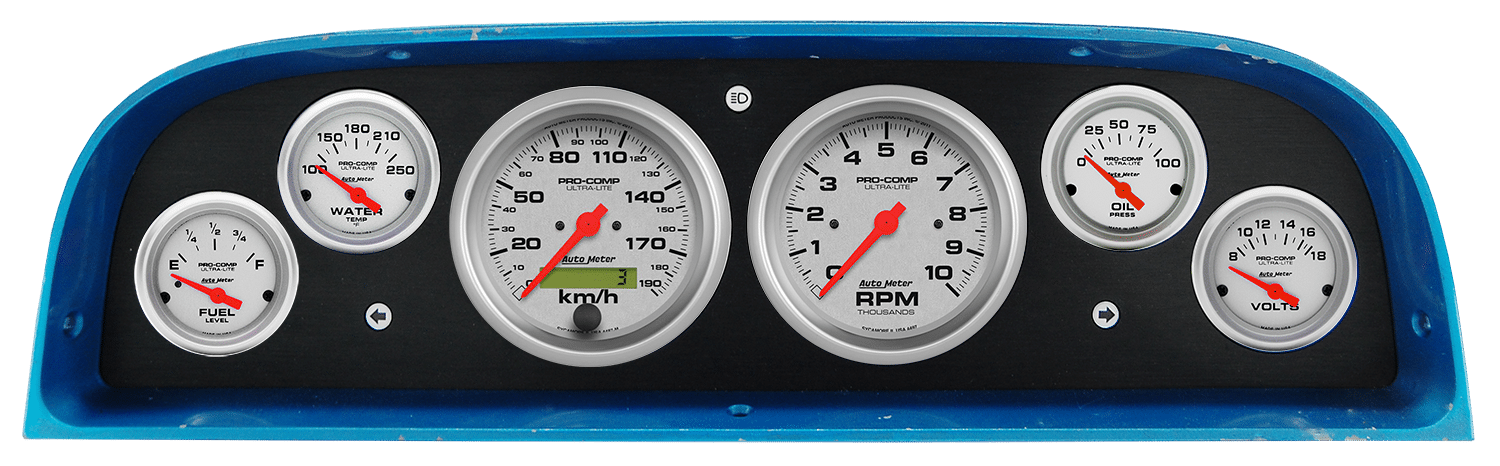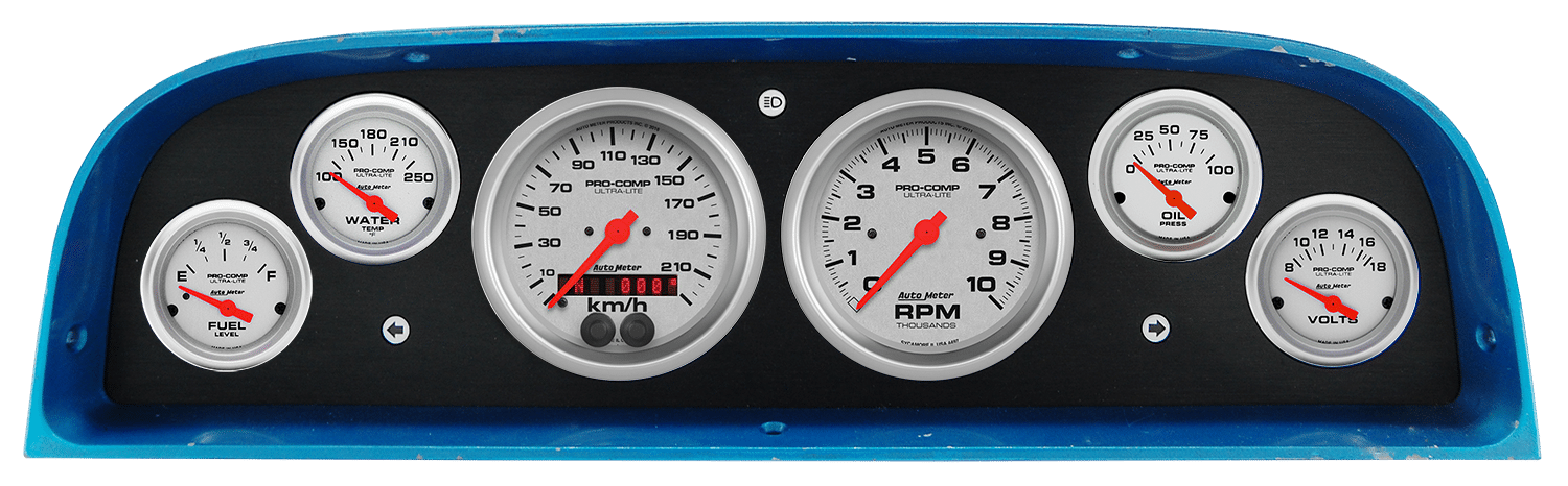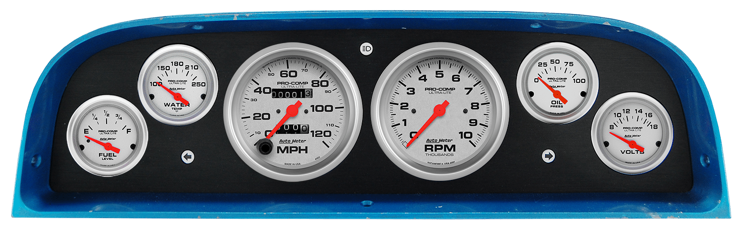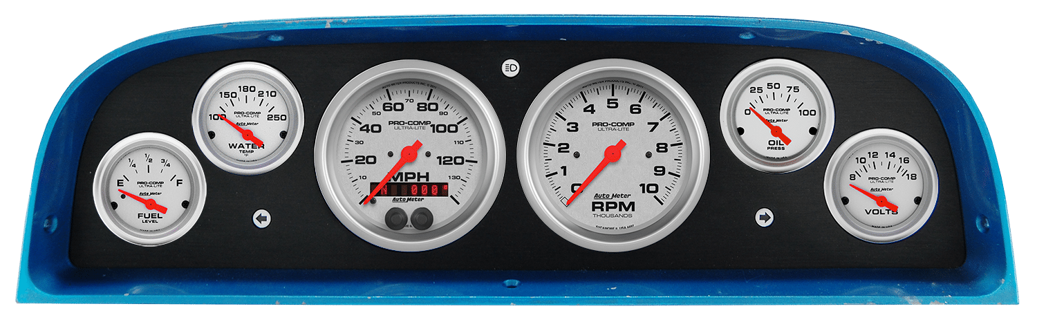 Includes brushed & black anodized aluminum gauge panel, AutoMeter Ultra-Lite gauges, & modern LED turn signal & high beam indicators.