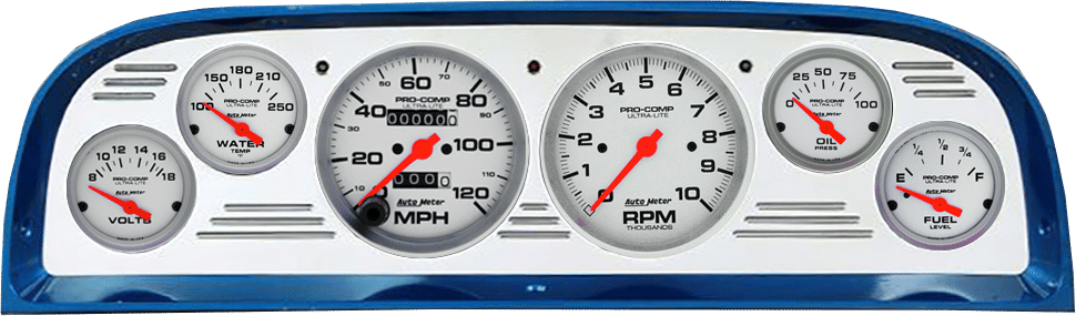Includes aluminum gauge panel, Auto Meter Ultra-Lite gauges, & LED lights (turn signal & high beam indicators).