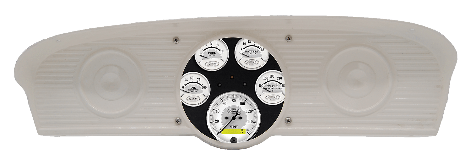Includes aluminum dash insert, AutoMeter Ford Masterpiece Silver gauges & turn signal/high beam indicators.