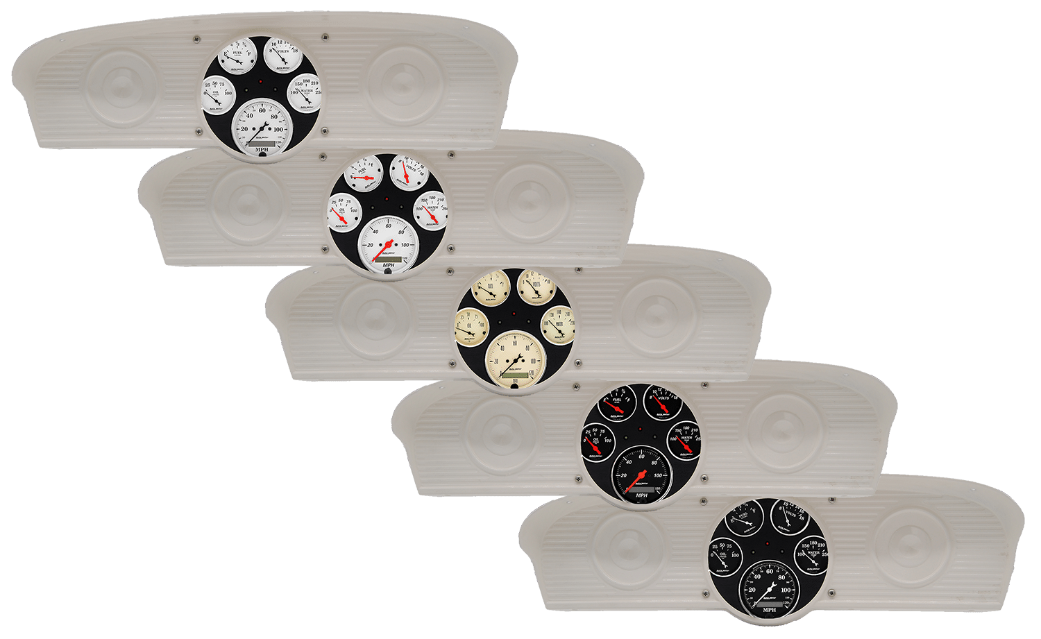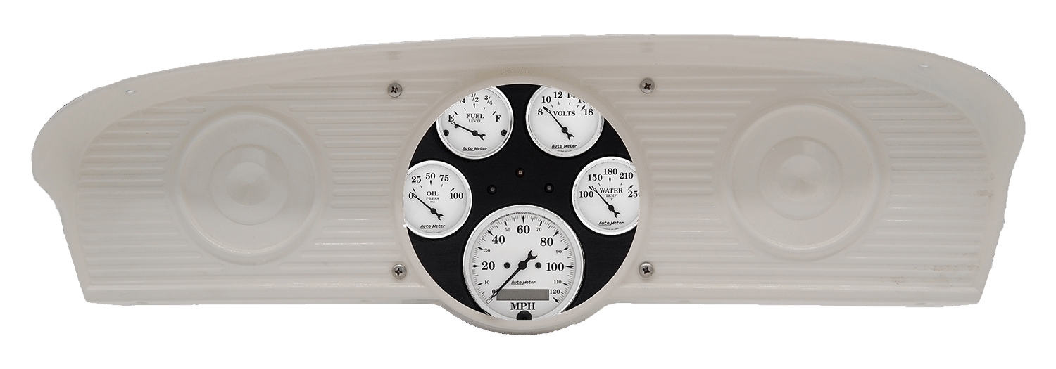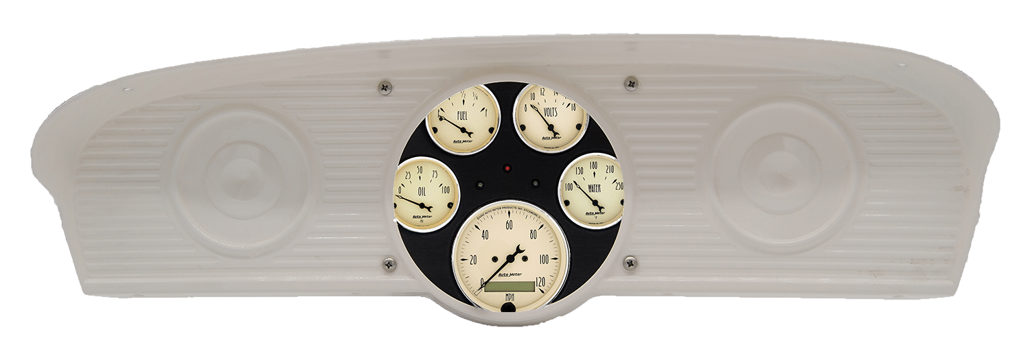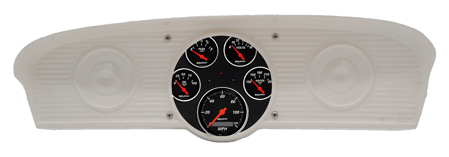 Includes aluminum gauge panel, AutoMeter Street Rod series gauges & turn signal/high beam indicators.