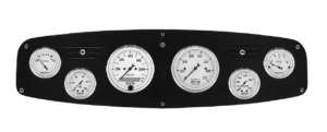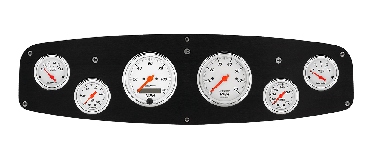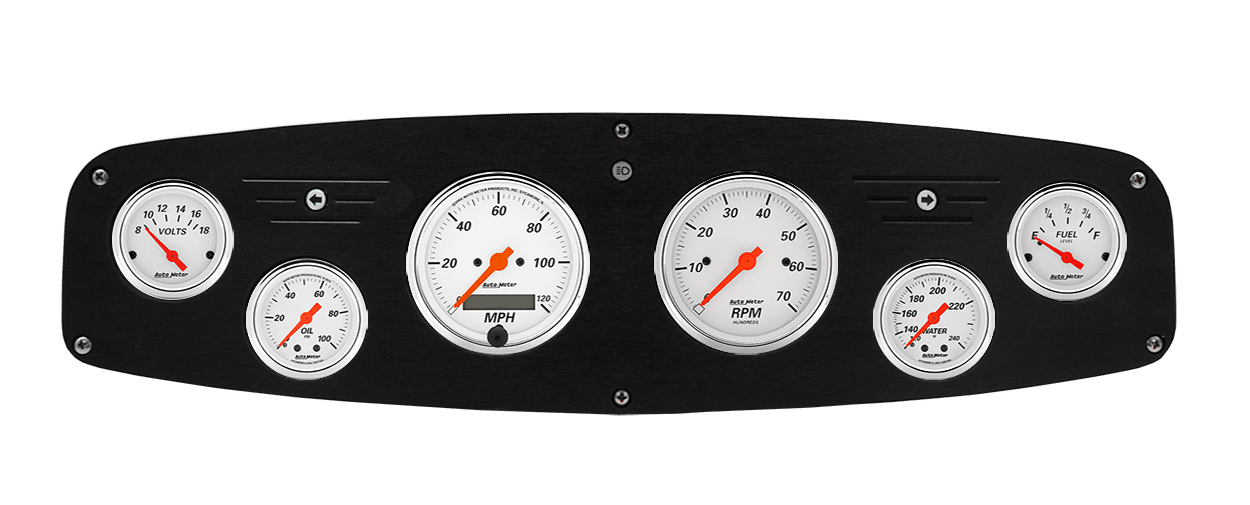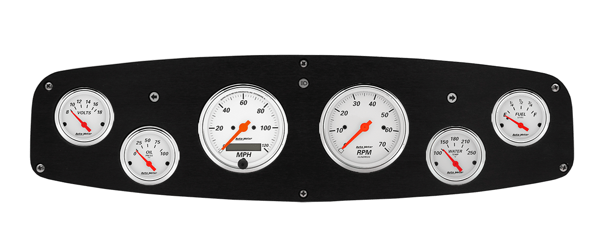 Includes aluminum gauge panel, Auto Meter Arctic White gauges, & LED lights (turn signal & high beam indicators).
