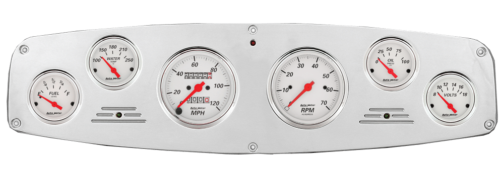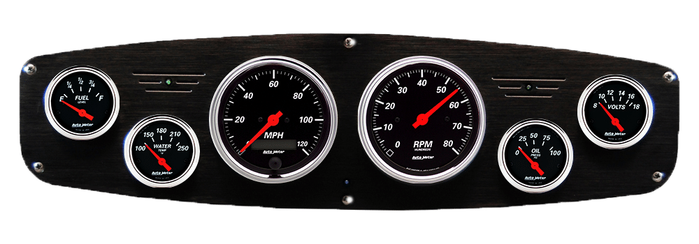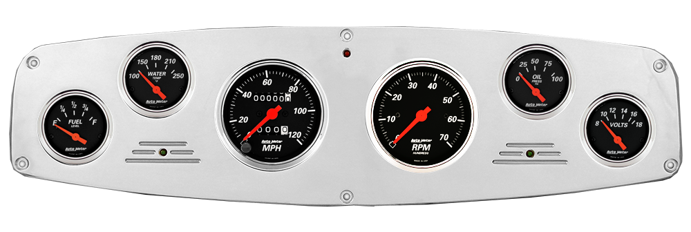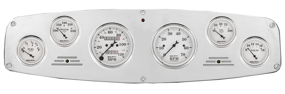 Includes aluminum dash insert, Auto Street Rod series gauges & turn signal/high beam indicators.