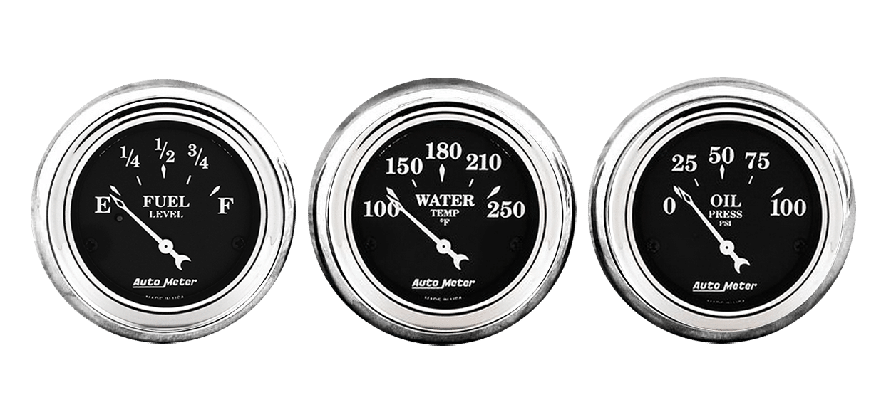 Includes 3 polished aluminum adapter rings & Auto Meter Old Tyme Black gauges.