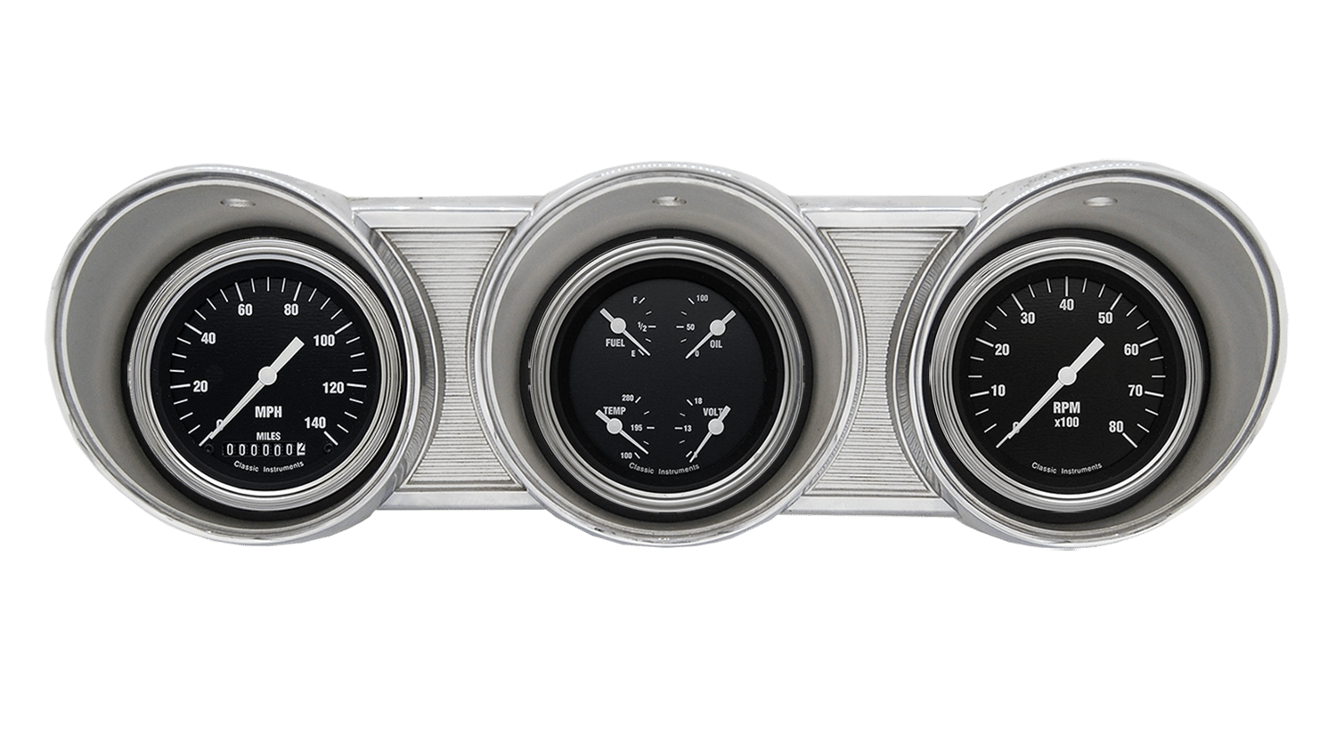 Includes aluminum adapter panel & Classic Instruments Hot Rod gauges