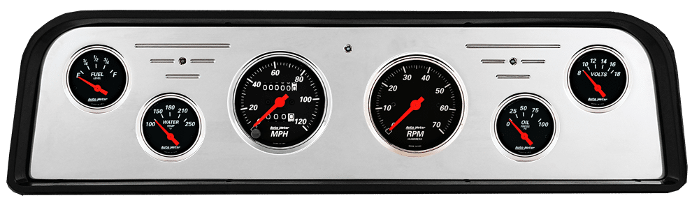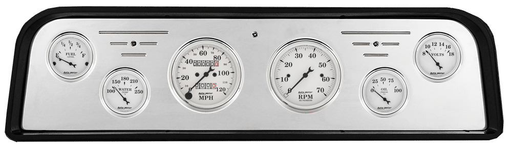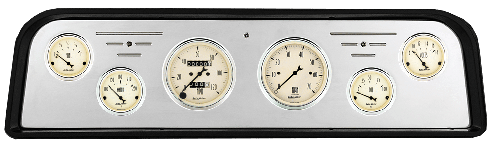 Includes aluminum dash insert, Auto Street Rod series gauges & turn signal/high beam indicators.