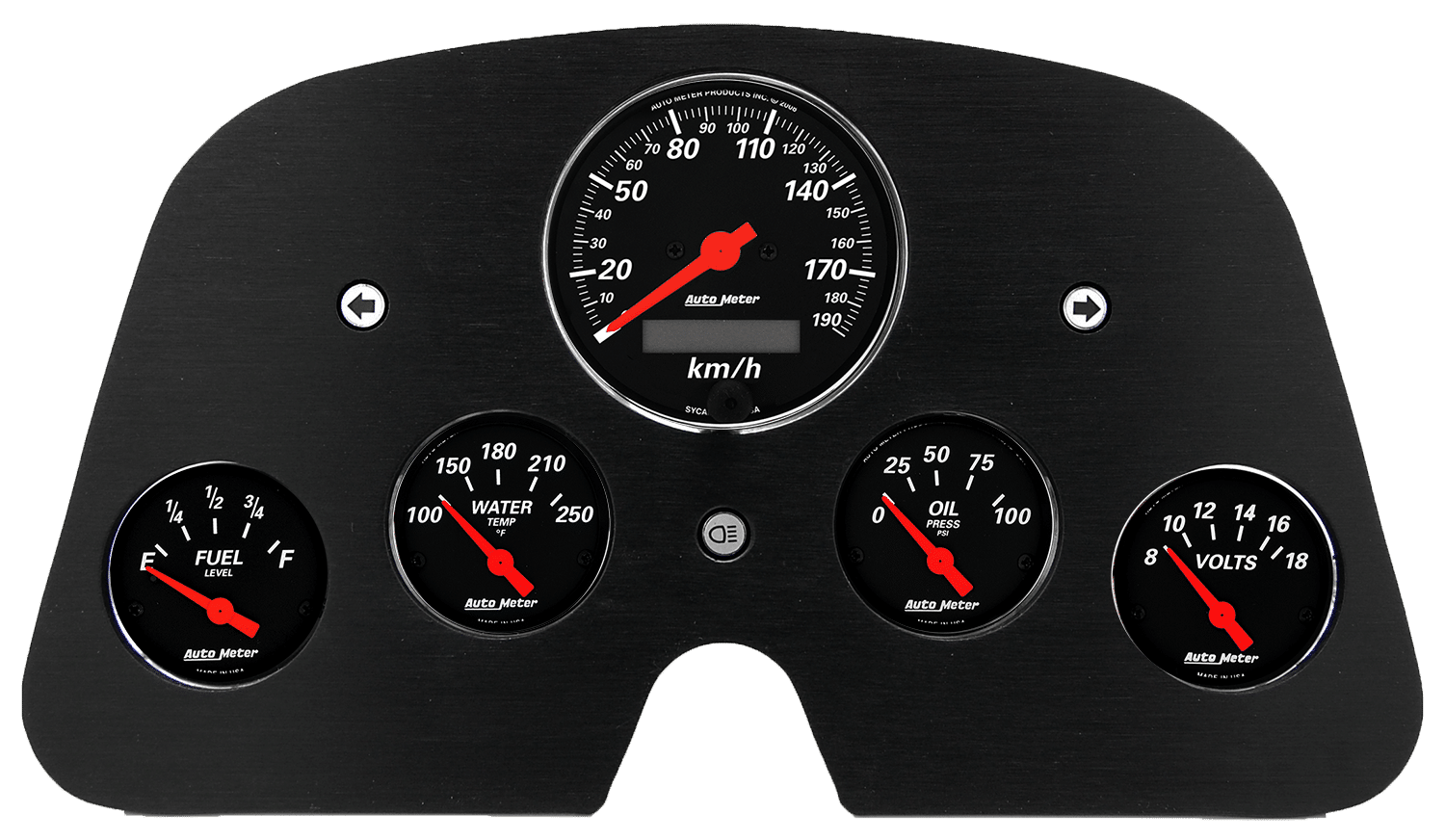 Includes aluminum gauge panel (brushed black), Auto Meter Designer Black gauge, & led lights (turn signal & high beam indicators).