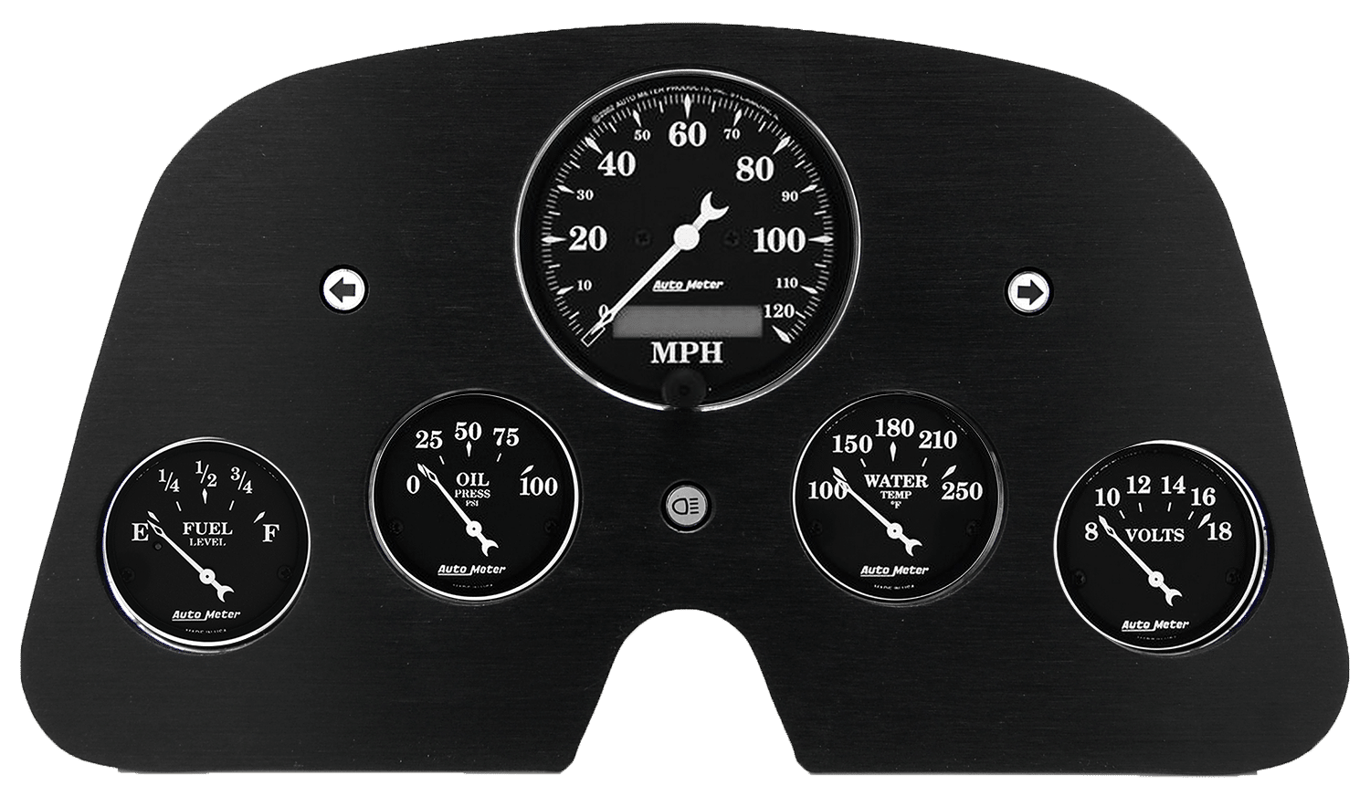 Includes aluminum gauge panel (brushed black), Auto Meter Old Tyme Black gauge, & led lights (turn signal & high beam indicators).