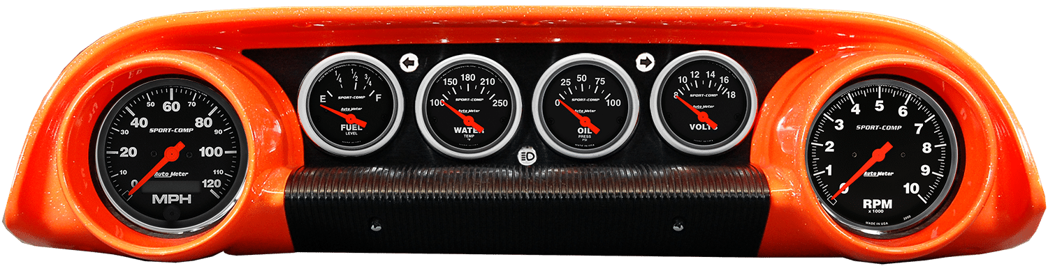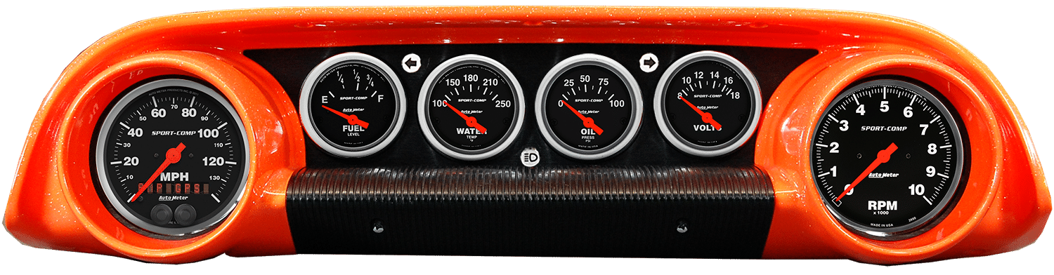 Includes brushed & black anodized aluminum gauge panels, Auto Meter Sport-Comp gauges, & LED turn signal & high beam indicators.