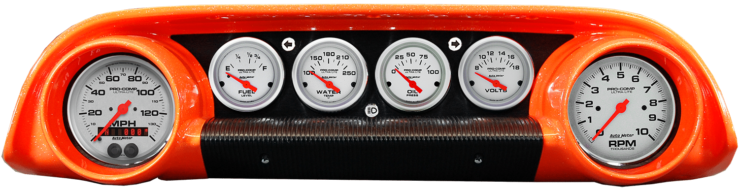 Includes brushed & black anodized aluminum gauge panels, Auto Meter Ultra-Lite gauges, & LED turn signal & high beam indicators.