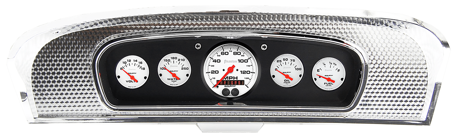 Includes brushed & black anodized aluminum gauge panel, Auto Meter Phantom gauges, & LED turn signal indicators.