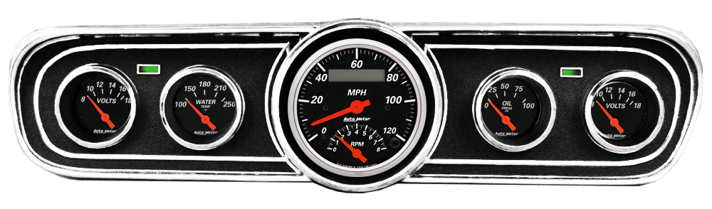 Includes aluminum adapter panels, AutoMeter Designer Black gauges, & turn signal indicators.