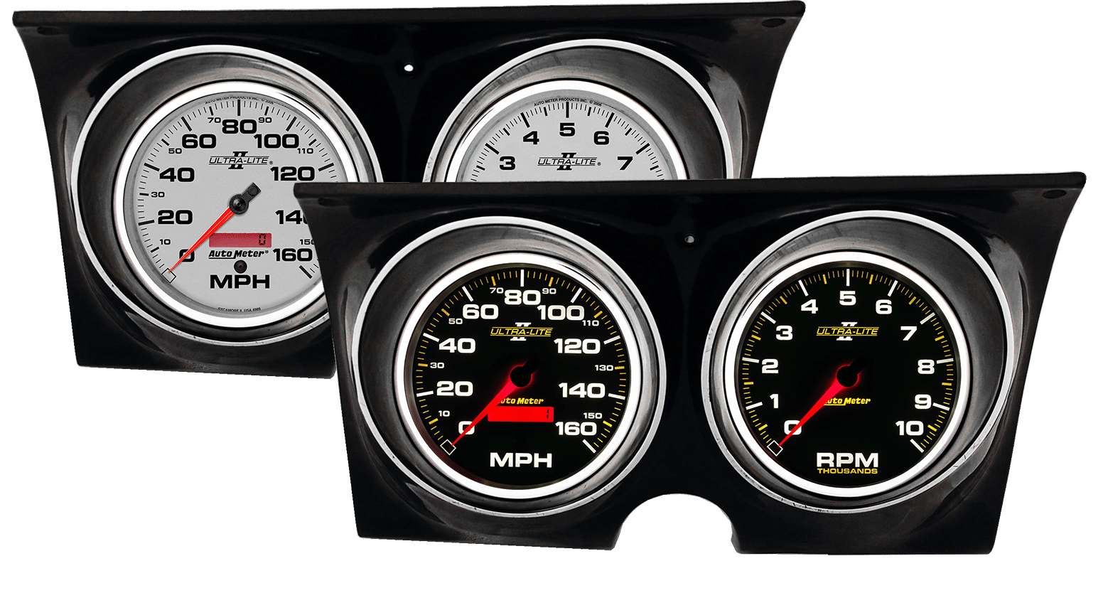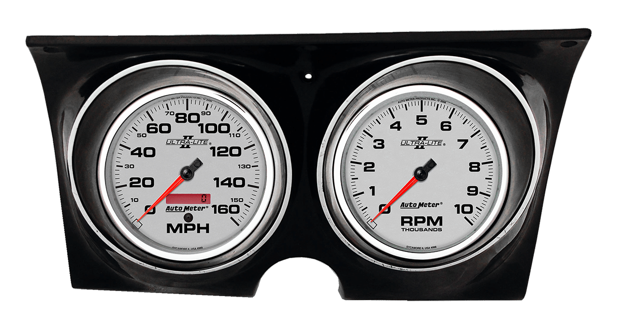 Includes polished aluminum adapter rings & Auto Meter Ultra-Lite II gauges.