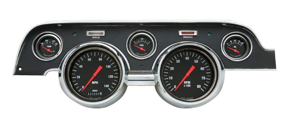 The 67-68 Mustange package includes: An electronic 140 MPH programmable speedometer, 8,000 RPM tachometer, 75-10 ohms fuel gauge (works w/ stock fuel sender), water temperature, oil pressure, and oil pressure. The package comes assembled & prewired by hand in a premium quality OEM dash bezel ready to bolt to your dash. Package includes Ford water temperature sender, oil pressure sender, & pulse signal generator for the programmable electronic speedometer.Additional information