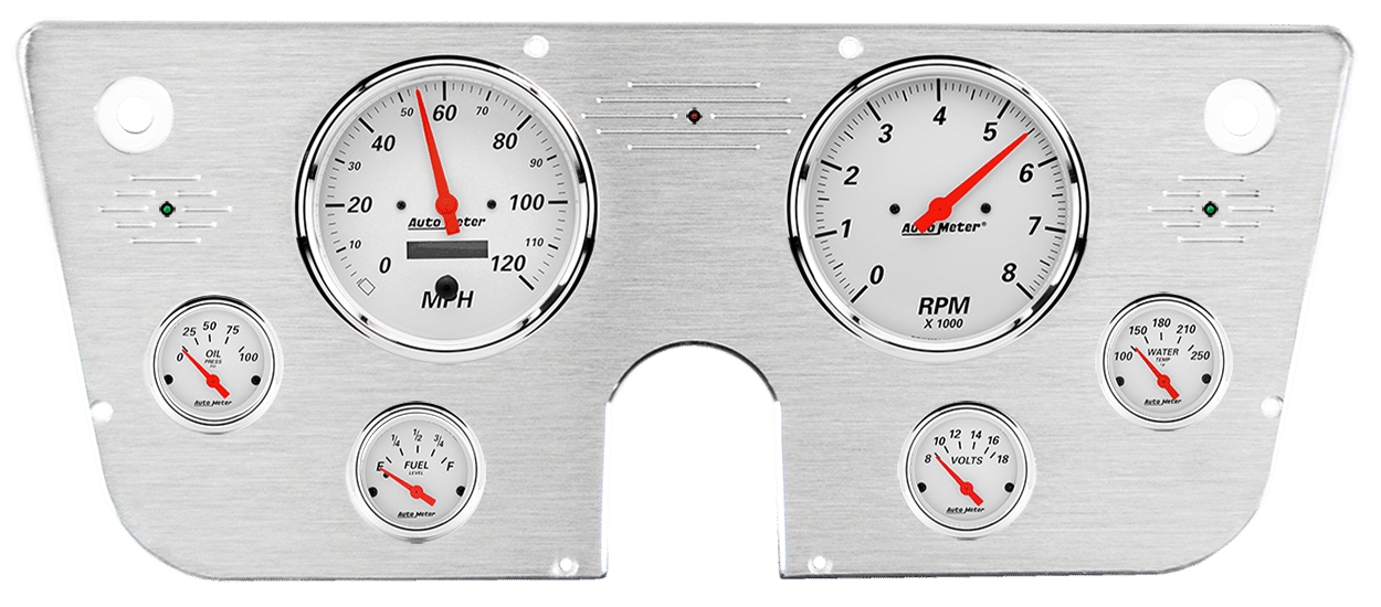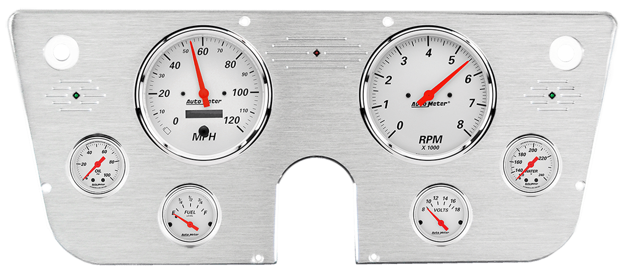 Includes aluminum dash insert, Auto Meter Arctic White gauges, & turn signal/high beam indicators.