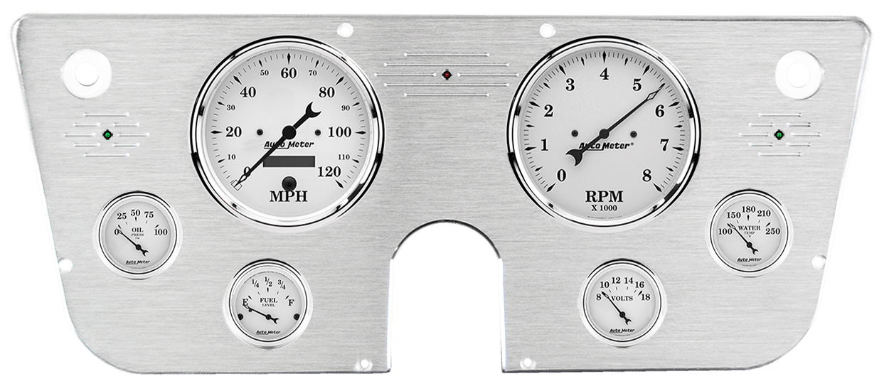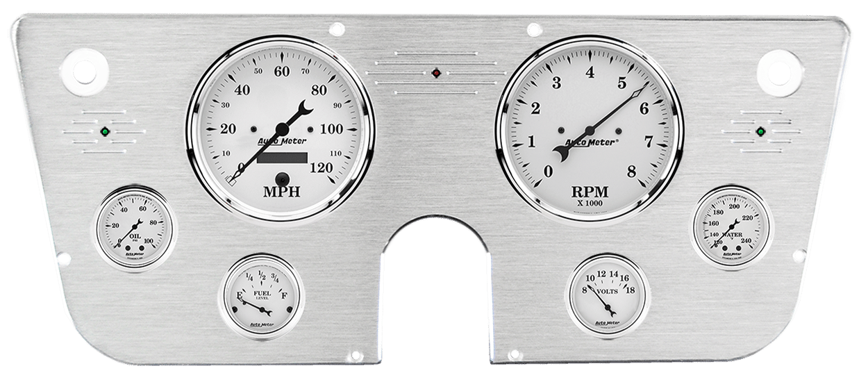 Includes aluminum dash insert, Auto Meter Old Tyme White gauges, & turn signal/high beam indicators.