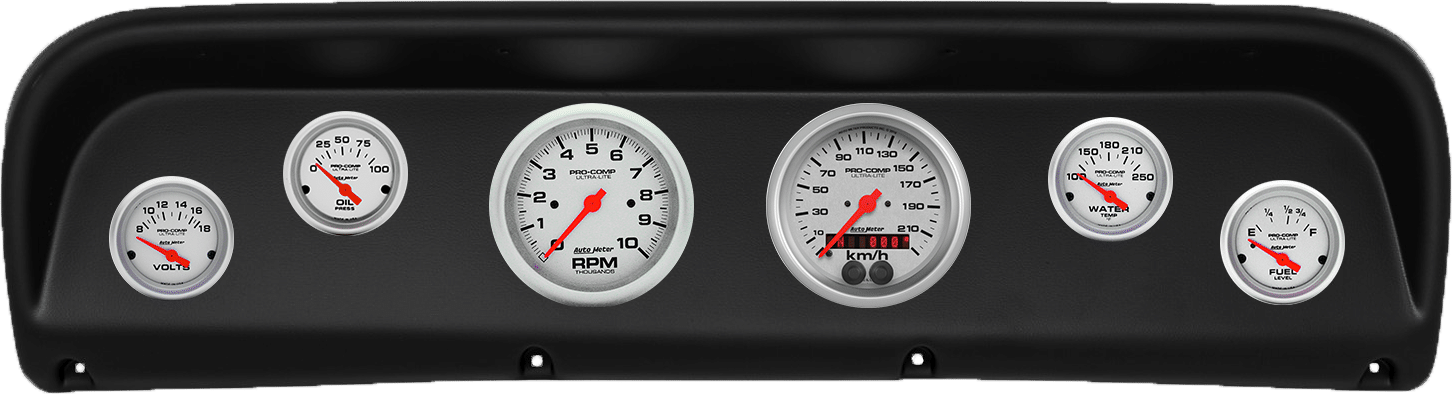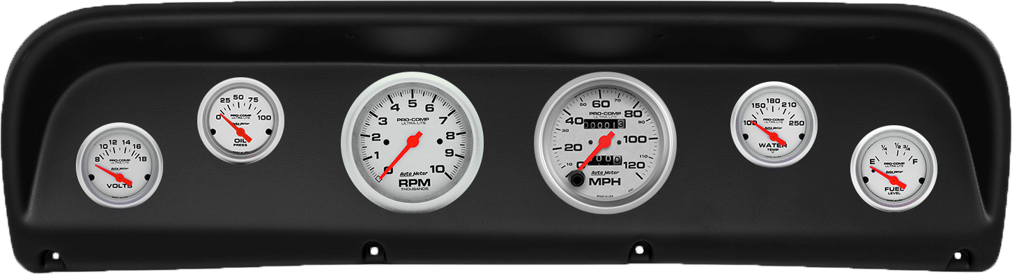Direct Fit replacement for OEM instrument bezel for 1967-72 Ford Truck made from thermoformed UV protected ABS material with AutoMeter Ultra-Lite gauges.