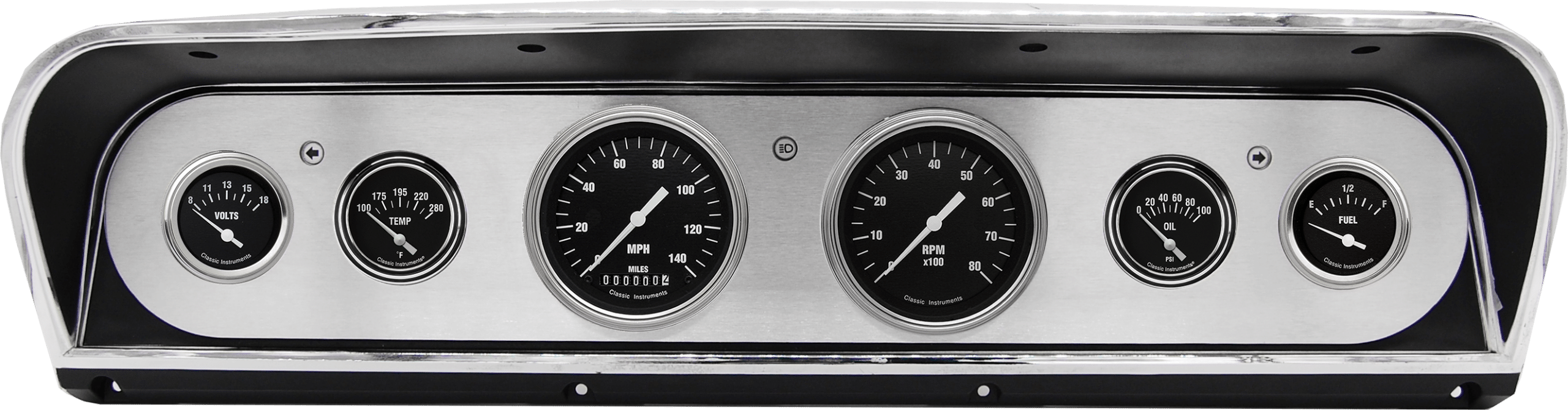 Includes aluminum gauge panel, Classic Instruments Hot Rod gauges, & LED turn signal & high beam indicators.