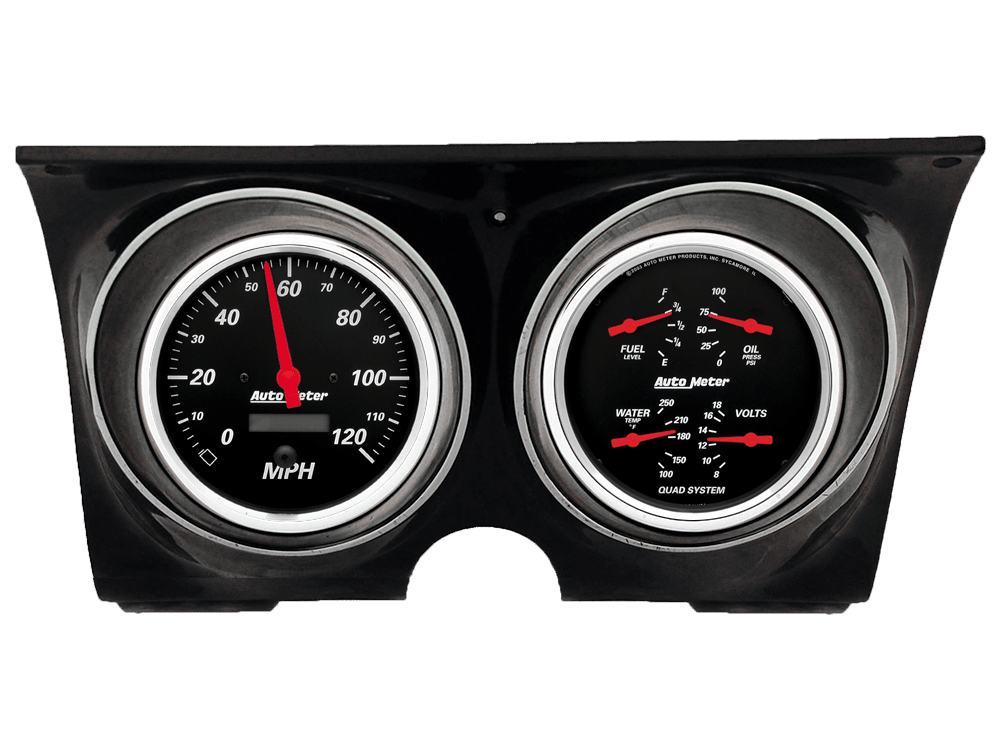 Includes aluminum adapter panels & Auto Meter Designer Black gauges.